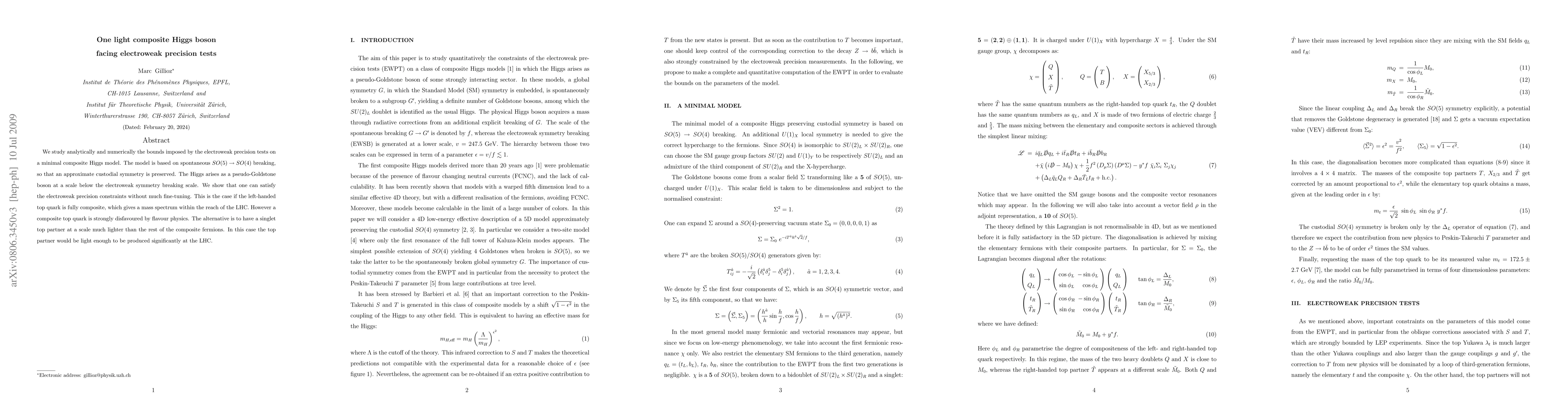 This paper investigates the constraints from electroweak precision tests on a minimal composite Higgs model with SO(5)/SO(4) symmetry breaking. It finds that a fully composite left-handed top quark can satisfy these constraints without significant fine-tuning, but such a scenario is disfavored by flavor physics. An alternative is a lighter singlet top partner, which could be produced at the LHC.