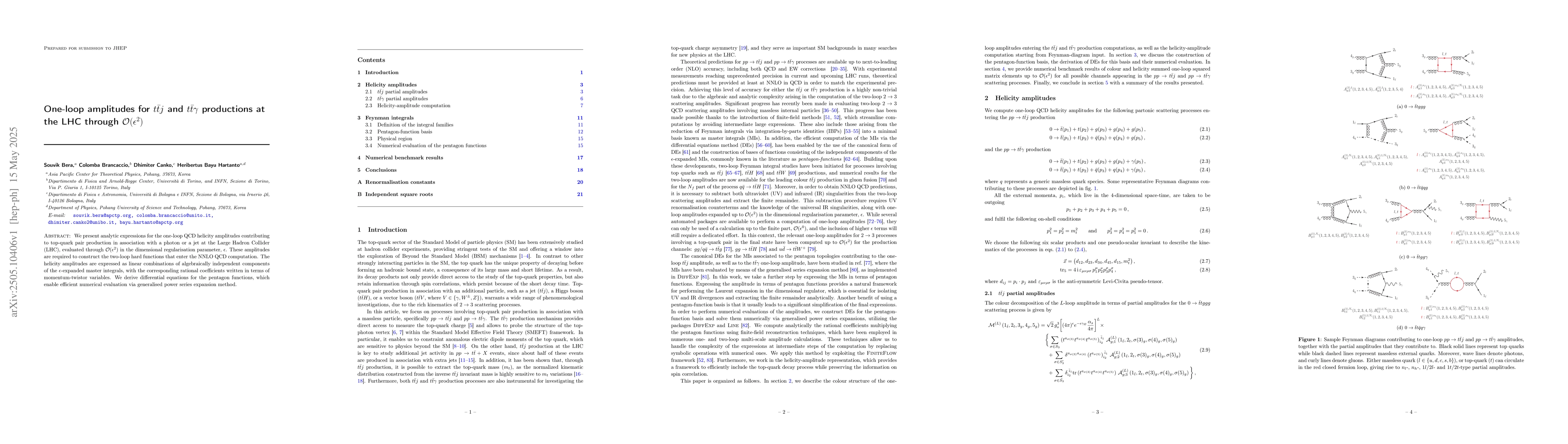 The research presents analytic expressions for one-loop QCD helicity amplitudes for top-quark pair production in association with a photon or a jet at the LHC, evaluated through $\mathcal{O}(\epsilon^2)$ in dimensional regularization.