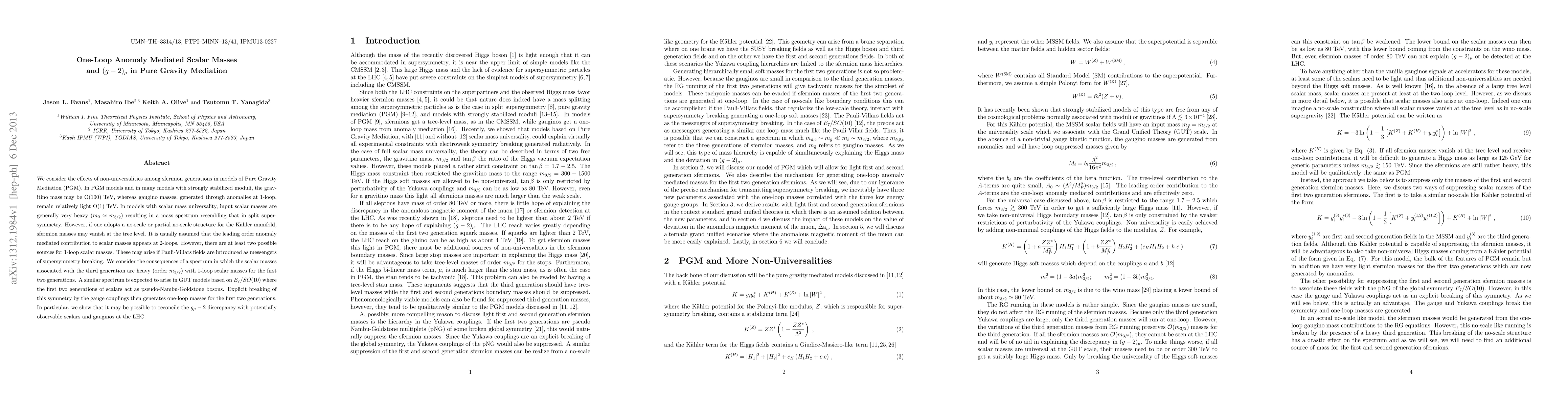 We consider the effects of non-universalities among sfermion generations in models of Pure Gravity Mediation (PGM). In PGM models and in many models with strongly stabilized moduli, the gravitino mass may be O(100) TeV, whereas gaugino masses, generated through anomalies at 1-loop, remain relatively light O(1) TeV. In models with scalar mass universality, input scalar masses are generally very heavy (m_0 \simeq m_{3/2}) resulting in a mass spectrum resembling that in split supersymmetry. However, if one adopts a no-scale or partial no-scale structure for the K\"ahler manifold, sfermion masses may vanish at the tree level. It is usually assumed that the leading order anomaly mediated contribution to scalar masses appears at 2-loops. However, there are at least two possible sources for 1-loop scalar masses. These may arise if Pauli-Villars fields are introduced as messengers of supersymmetry breaking. We consider the consequences of a spectrum in which the scalar masses associated with the third generation are heavy (order m_{3/2}) with 1-loop scalar masses for the first two generations. A similar spectrum is expected to arise in GUT models based on E_7/SO(10) where the first two generations of scalars act as pseudo-Nambu-Goldstone bosons. Explicit breaking of this symmetry by the gauge couplings then generates one-loop masses for the first two generations. In particular, we show that it may be possible to reconcile the g_mu - 2 discrepancy with potentially observable scalars and gauginos at the LHC.