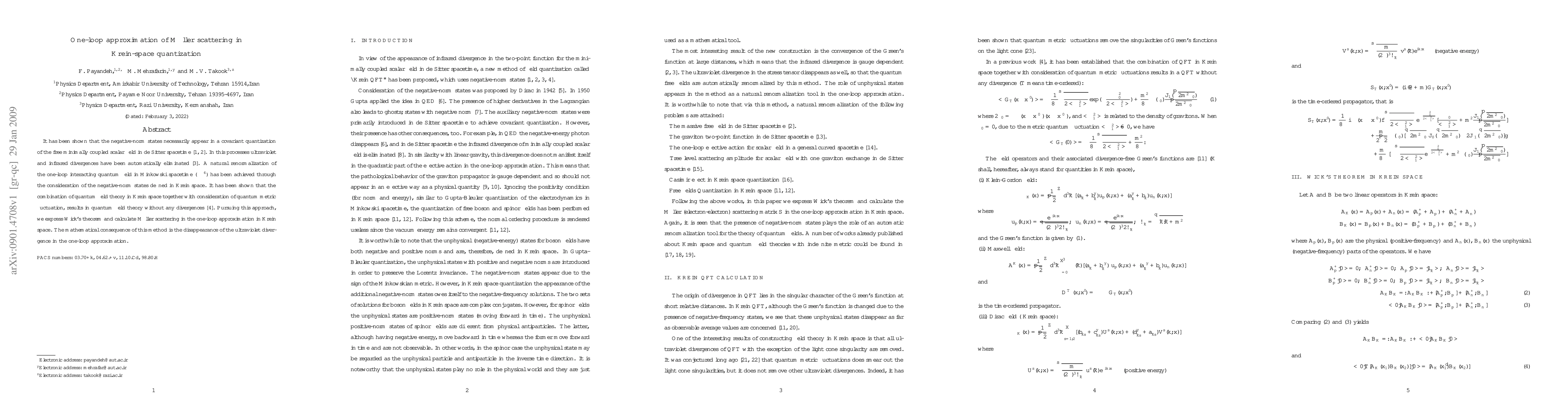 It has been shown that the negative-norm states necessarily appear in a covariant quantization of the free minimally coupled scalar field in de Sitter spacetime [1,2]. In this processes ultraviolet and infrared divergences have been automatically eliminated [3]. A natural renormalization of the one-loop interacting quantum field in Minkowski spacetime ($\lambda\phi^4$) has been achieved through the consideration of the negative-norm states defined in Krein space. It has been shown that the combination of quantum field theory in Krein space together with consideration of quantum metric fluctuation, results in quantum field theory without any divergences [4]. Pursuing this approach, we express Wick's theorem and calculate M{\o}ller scattering in the one-loop approximation in Krein space. The mathematical consequence of this method is the disappearance of the ultraviolet divergence in the one-loop approximation.