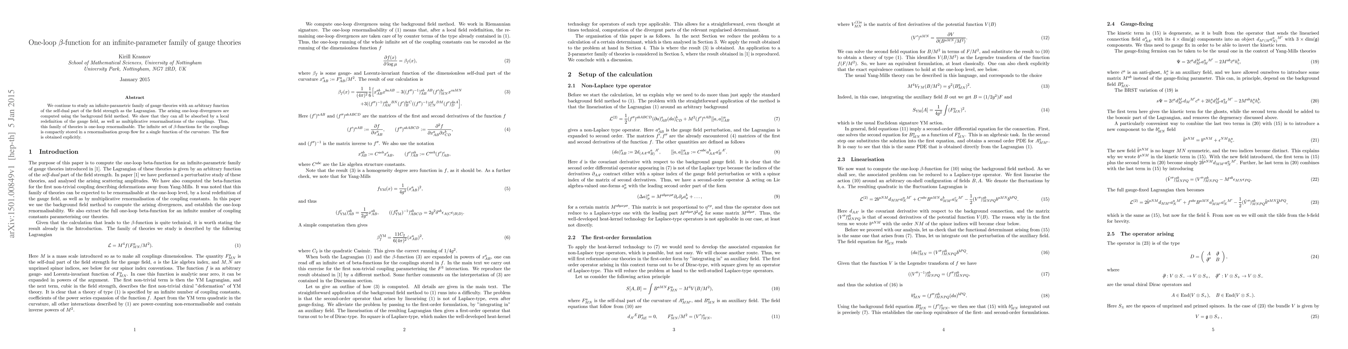 We continue to study an infinite-parametric family of gauge theories with an arbitrary function of the self-dual part of the field strength as the Lagrangian. The arising one-loop divergences are computed using the background field method. We show that they can all be absorbed by a local redefinition of the gauge field, as well as multiplicative renormalisations of the couplings. Thus, this family of theories is one-loop renormalisable. The infinite set of beta-functions for the couplings is compactly stored in a renormalisation group flow for a single function of the curvature. The flow is obtained explicitly.