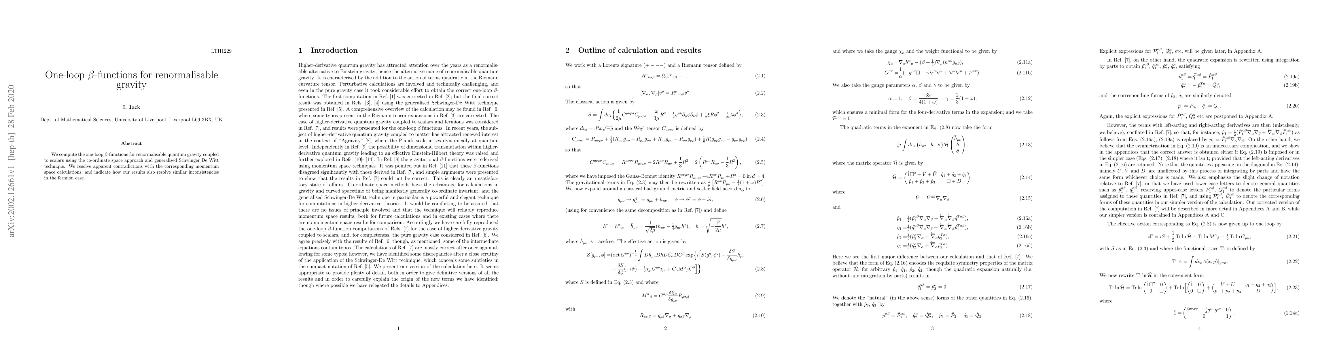 We compute the one-loop beta-functions for renormalisable quantum gravity coupled to scalars using the co-ordinate space approach and generalised Schwinger De Witt technique. We resolve apparent contradictions with the corresponding momentum space calculations, and indicate how our results also resolve similar inconsistencies in the fermion case.