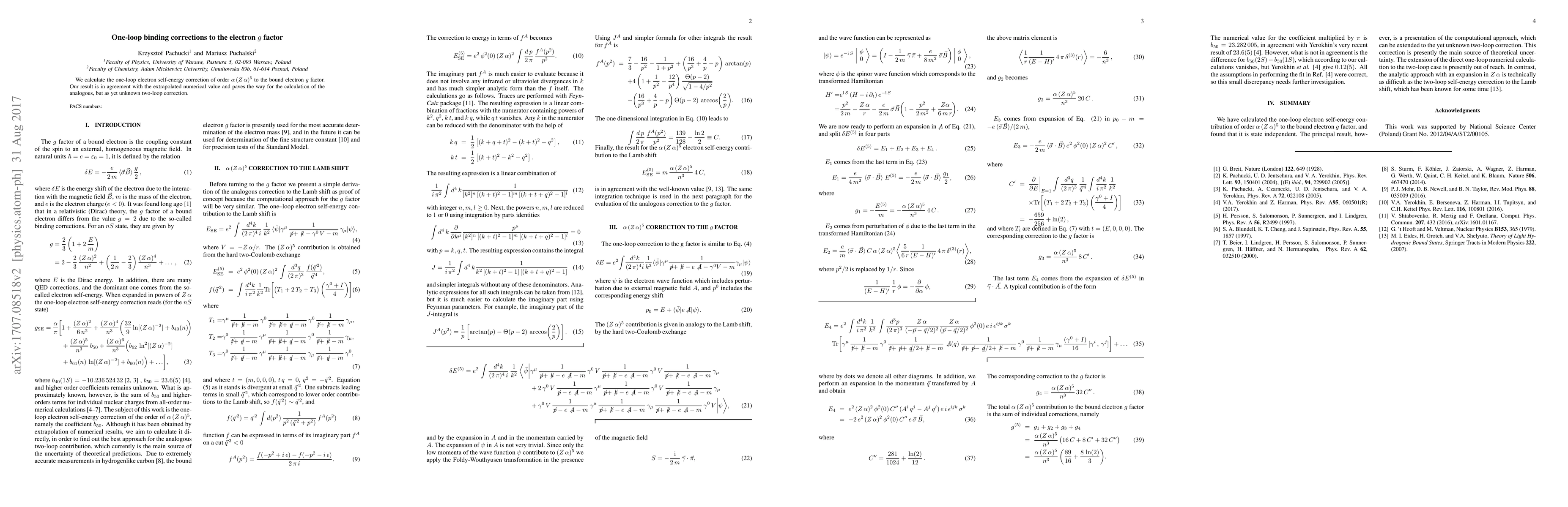 This paper calculates the one-loop self-energy correction to the electron $g$ factor at order $\alpha(Z\alpha)^5$, aligning with extrapolated numerical values, and sets the stage for future two-loop correction computations.