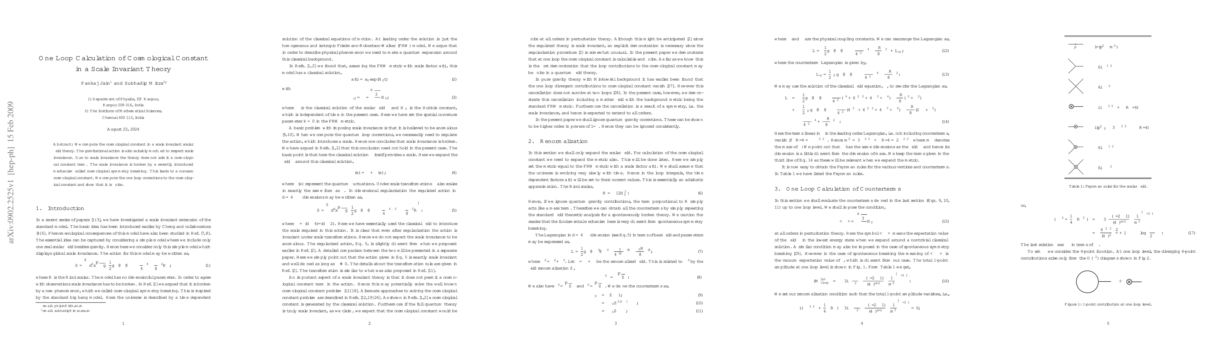 This paper computes the one-loop corrections to the cosmological constant in a scale invariant scalar field theory, where the cosmological constant emerges through a mechanism called cosmological symmetry breaking, resulting in a finite value.