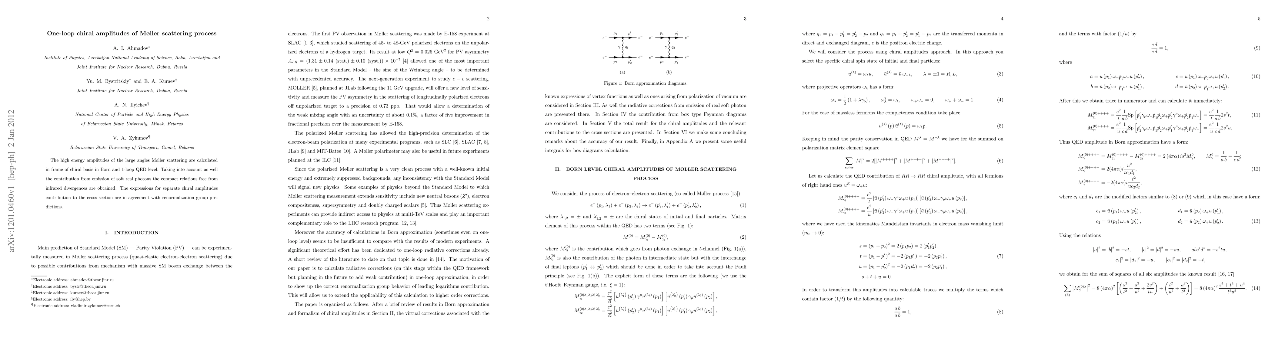 This paper calculates high-energy one-loop chiral amplitudes for Moller scattering in both Born and QED 1-loop frameworks, incorporating soft photon emission to avoid infrared divergences, and confirms the results align with renormalization group predictions.