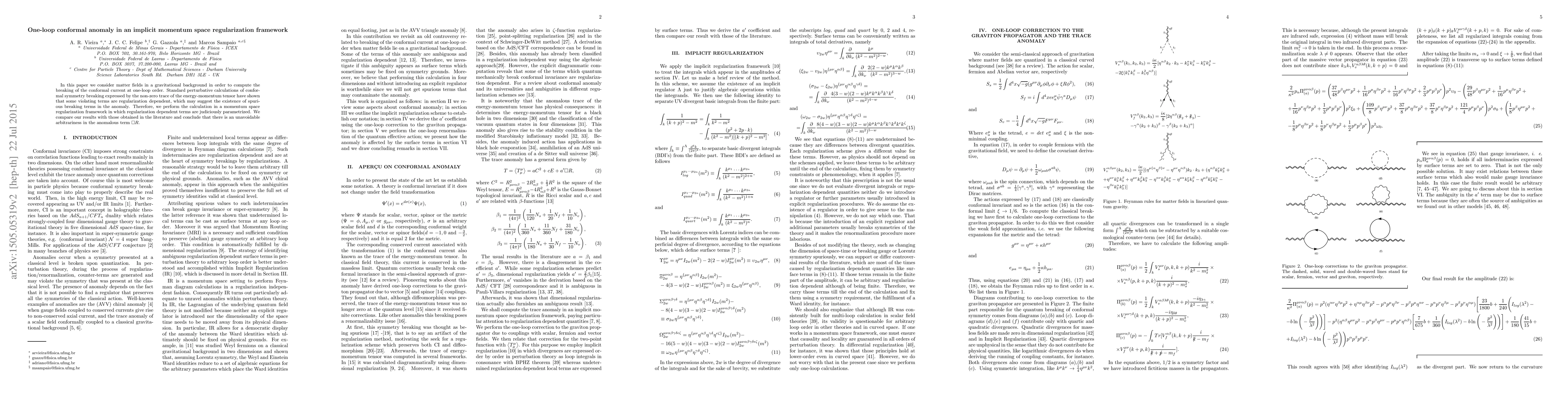 In this paper we consider matter fields in a gravitational background in order to compute the breaking of the conformal current at one-loop order. Standard perturbative calculations of conformal symmetry breaking expressed by the non-zero trace of the energy-momentum tensor have shown that some violating terms are regularization dependent, which may suggest the existence of spurious breaking terms in the anomaly. Therefore, we perform the calculation in a momentum space regularization framework in which regularization dependent terms are judiciously parametrized. We compare our results with those obtained in the literature and conclude that there is an unavoidable arbitrariness in the anomalous term $\Box R$.