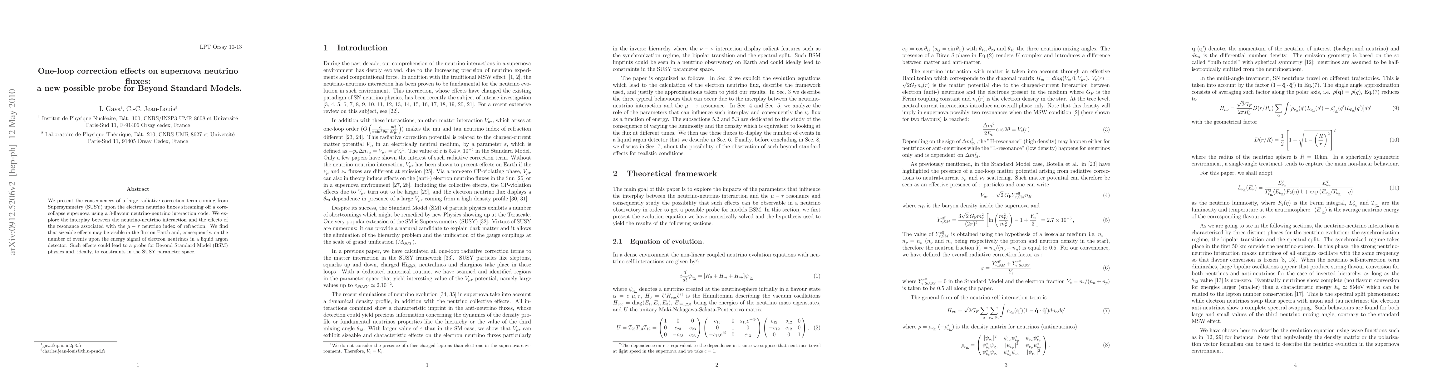 We present the consequences of a large radiative correction term coming from Supersymmetry (SUSY) upon the electron neutrino fluxes streaming off a core- collapse supernova using a 3-flavor neutrino-neutrino interaction code. We explore the interplay between the neutrino-neutrino interaction and the effects of the resonance associated with the mu-tau neutrino index of refraction. We find that sizeable effects may be visible in the flux on Earth and, consequently, on the number of events upon the energy signal of electron neutrinos in a liquid argon detector. Such effect could lead to a probe for Beyond Standard Model (BSM) physics and, ideally, to constraints in the SUSY parameter space.