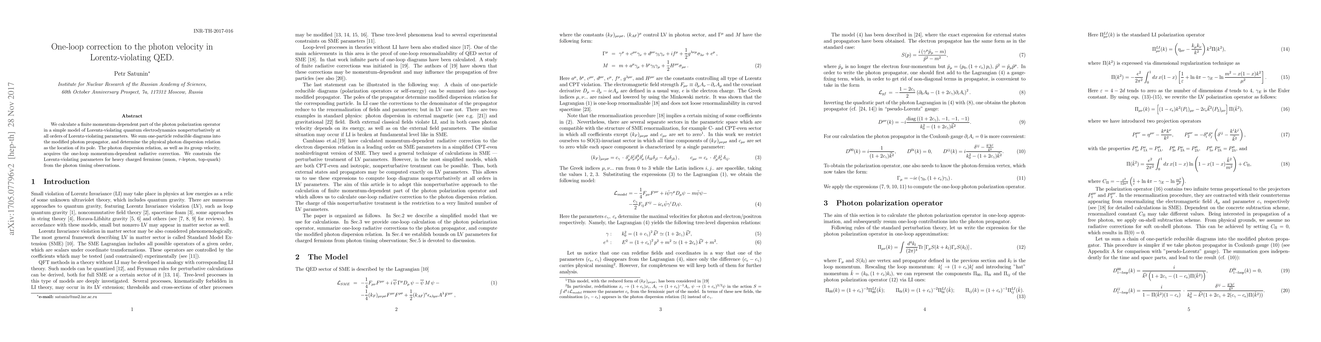 This paper computes one-loop corrections to the photon velocity in a Lorentz-violating quantum electrodynamics framework, determining the momentum-dependent radiative correction to the photon dispersion relation and constraining Lorentz-violating parameters from photon timing observations.