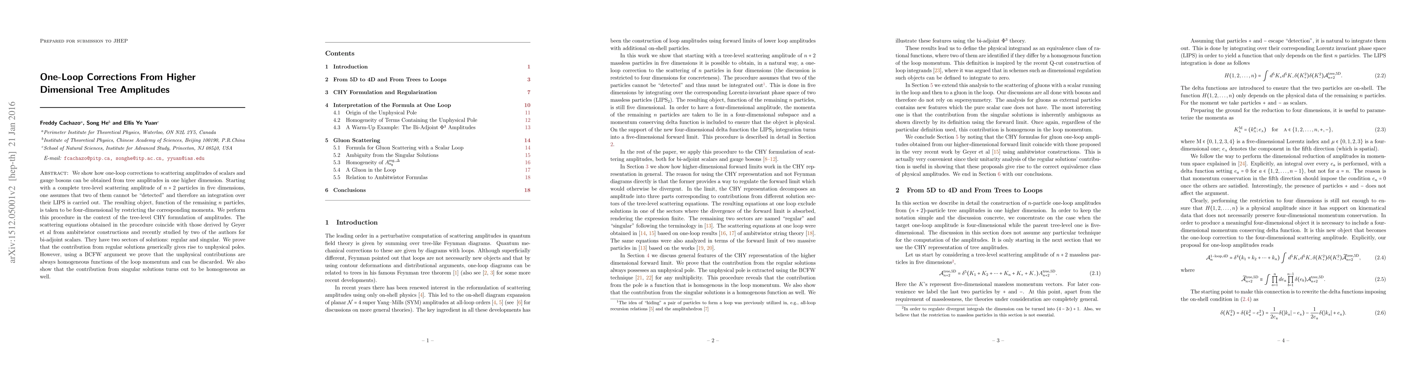 We show how one-loop corrections to scattering amplitudes of scalars and gauge bosons can be obtained from tree amplitudes in one higher dimension. Starting with a complete tree-level scattering amplitude of n+2 particles in five dimensions, one assumes that two of them cannot be "detected" and therefore an integration over their LIPS is carried out. The resulting object, function of the remaining n particles, is taken to be four-dimensional by restricting the corresponding momenta. We perform this procedure in the context of the tree-level CHY formulation of amplitudes. The scattering equations obtained in the procedure coincide with those derived by Geyer et al from ambitwistor constructions and recently studied by two of the authors for bi-adjoint scalars. They have two sectors of solutions: regular and singular. We prove that the contribution from regular solutions generically gives rise to unphysical poles. However, using a BCFW argument we prove that the unphysical contributions are always homogeneous functions of the loop momentum and can be discarded. We also show that the contribution from singular solutions turns out to be homogeneous as well.