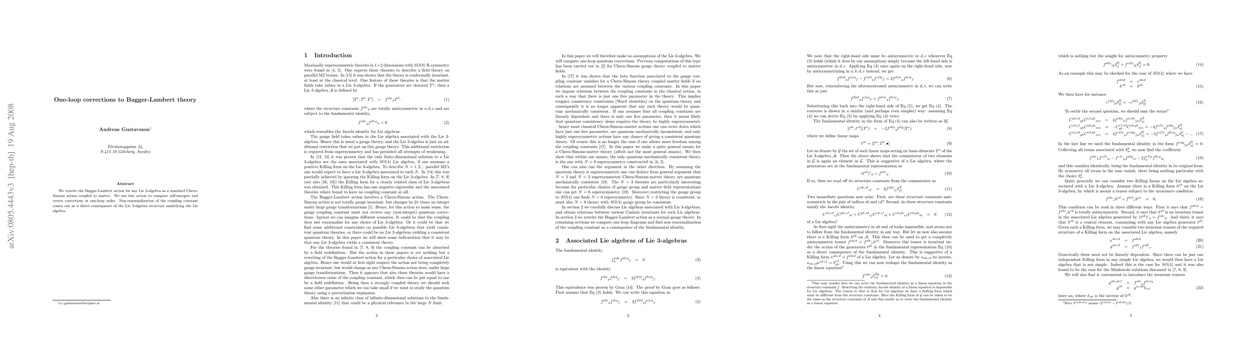 We rewrite the Bagger-Lambert action for any Lie 3-algebra as a standard Chern- Simons action coupled to matter. We use this action to compute self-energies and vertex corrections at one-loop order. Non-renormalization of the coupling constant comes out as a direct consequence of the Lie 3-algebra structure underlying the Lie algebra.