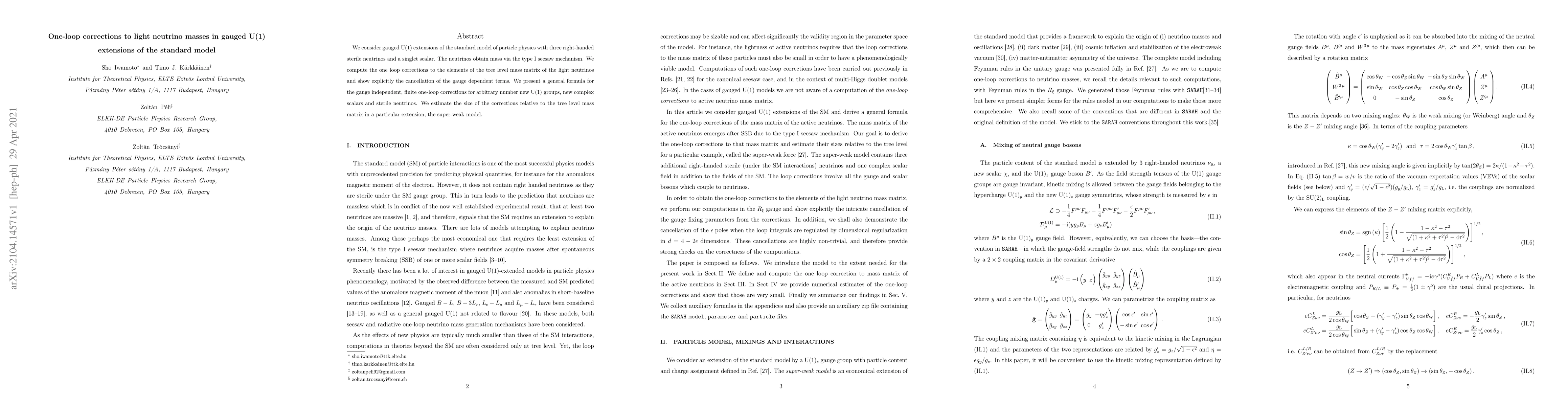 This paper explores one-loop corrections to light neutrino masses in gauged U(1) extensions of the Standard Model, employing the type I seesaw mechanism with sterile neutrinos and a singlet scalar. It provides a general formula for gauge independent, finite one-loop corrections and estimates their size relative to the tree level mass matrix in the super-weak model.