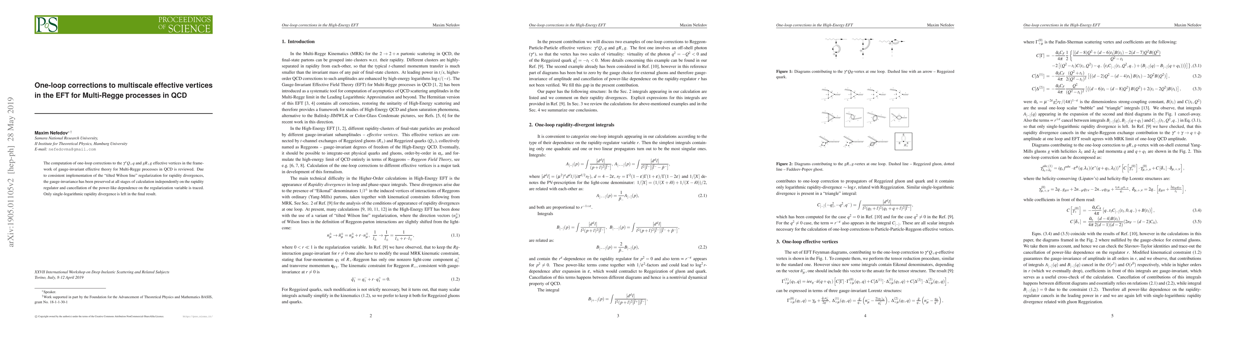 The computation of one-loop corrections to the $\gamma^\star Q_+ q$ and $gR_+g$ effective vertices in the framework of gauge-invariant effective theory for Multi-Regge processes in QCD is reviewed. Due to consistent implementation of the "tilted Wilson line" regularization for rapidity divergences, the gauge-invariance has been preserved at all stages of calculation independently on the rapidity regulator and cancellation of the power-like dependence on the regularization variable is traced. Only single-logarithmic rapidity divergence is left in the final result.