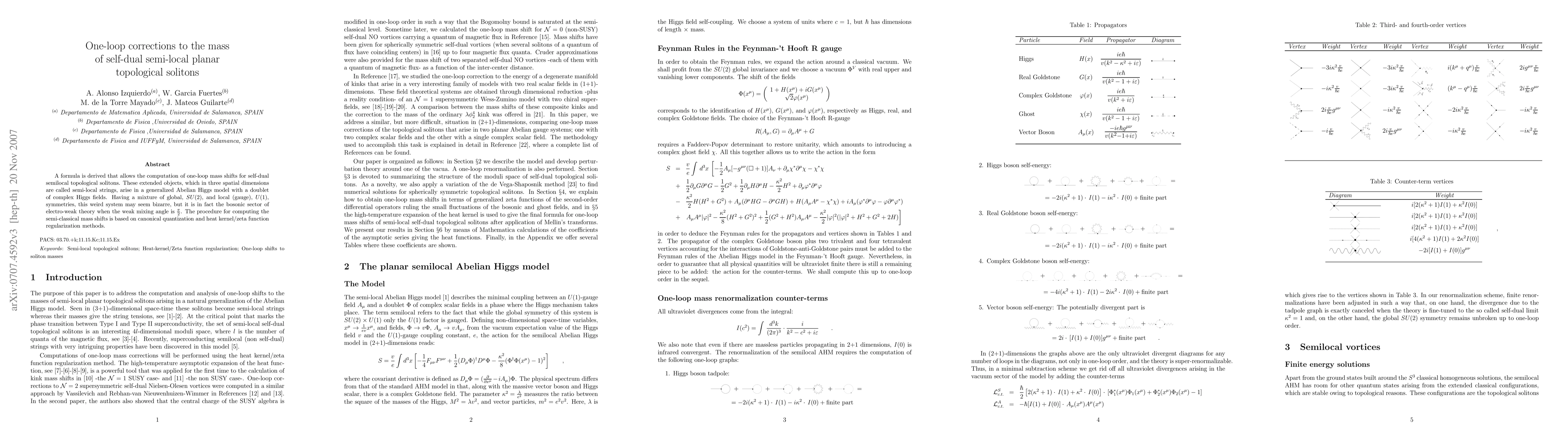Summary: This paper derives a formula for calculating one-loop mass corrections in self-dual semi-local topological solitons, termed semi-local strings, within a generalized Abelian Higgs model. The method employs canonical quantization and heat kernel regularization to determine semi-classical mass shifts.