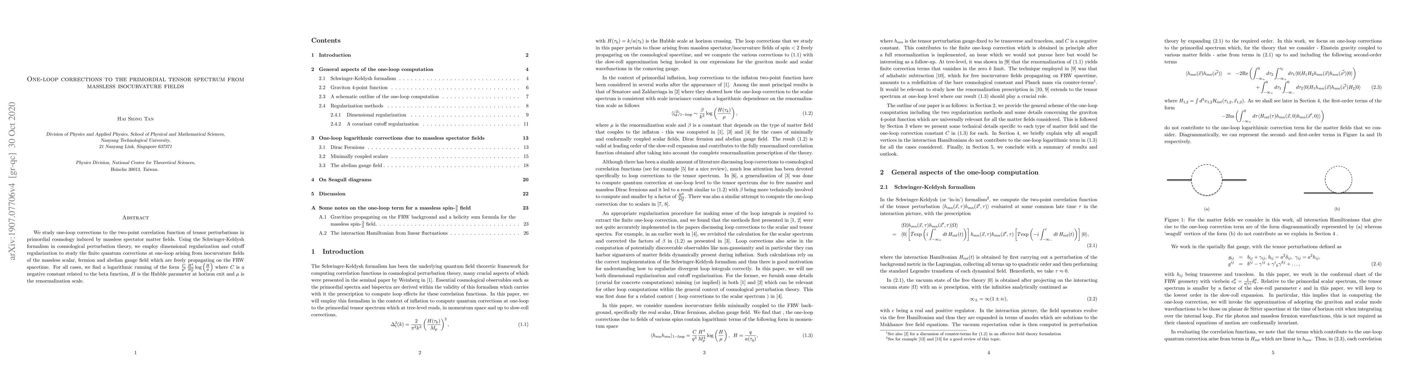 We study one-loop corrections to the two-point correlation function of tensor perturbations in primordial cosmology induced by massless spectator matter fields. Using the Schwinger-Keldysh formalism in cosmological perturbation theory, we employ dimensional regularization and cutoff regularization to study the finite quantum corrections at one-loop arising from isocurvature fields of the massless scalar, fermion and abelian gauge field which are freely propagating on the FRW spacetime. For all cases, we find a logarithmic running of the form $\frac{C}{q^3} \, \frac{H^4}{M^4_p} \log \left( \frac{H}{\mu } \right)$ where $C$ is a negative constant related to the beta function, $H$ is the Hubble parameter at horizon exit and $\mu$ is the renormalization scale.
