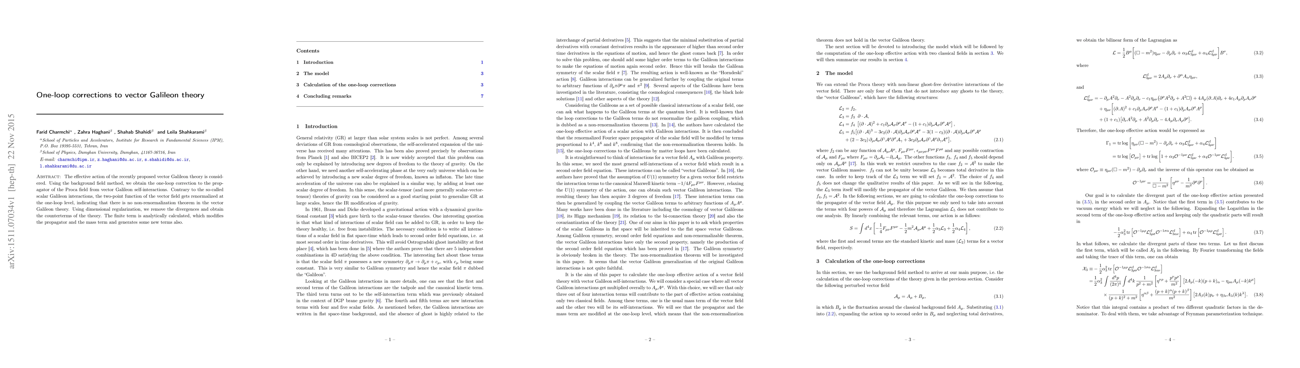 This paper investigates the one-loop corrections to the vector Galileon theory, revealing that the vector field's propagator is renormalized at this level, unlike scalar Galileon interactions. The authors employ dimensional regularization to compute counterterms, which modify the propagator and mass term, and introduce new terms.