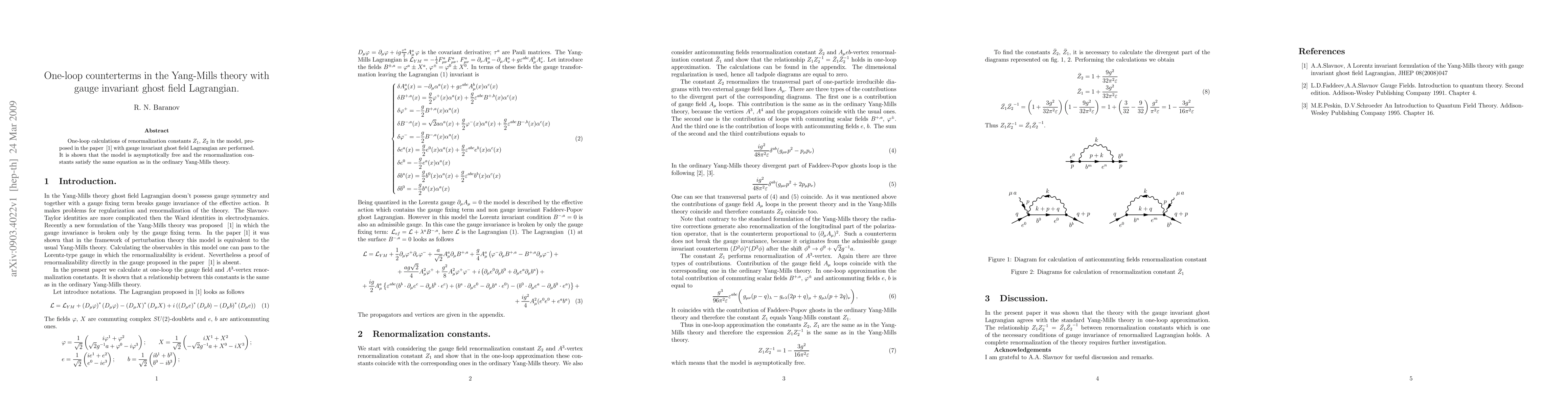 One-loop calculations of renormalization constants in the model with gauge invariant ghost field Lagrangian are performed. It is shown that the model is asymptotically free and the renormalization constants satisfy the same equation as in the ordinary Yang-Mills theory.