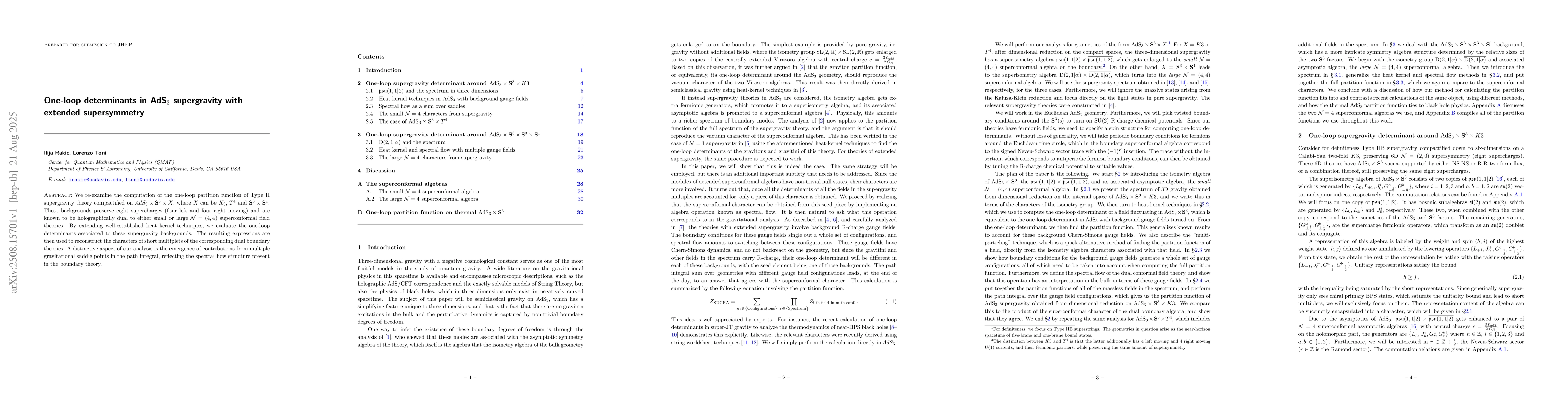 We re-examine the computation of the one-loop partition function of Type II supergravity theory compactified on $AdS_3 \times \mathbf{S}^3 \times X$, where $X$ can be $K_3$, $T^4$ and $\mathbf{S}^3 \times \mathbf{S}^1$. These backgrounds preserve eight supercharges (four left and four right moving) and are known to be holographically dual to either small or large $N=(4,4)$ superconformal field theories. By extending well-established heat kernel techniques, we evaluate the one-loop determinants associated to these supergravity backgrounds. The resulting expressions are then used to reconstruct the characters of short multiplets of the corresponding dual boundary theories. A distinctive aspect of our analysis is the emergence of contributions from multiple gravitational saddle points in the path integral, reflecting the spectral flow structure present in the boundary theory.