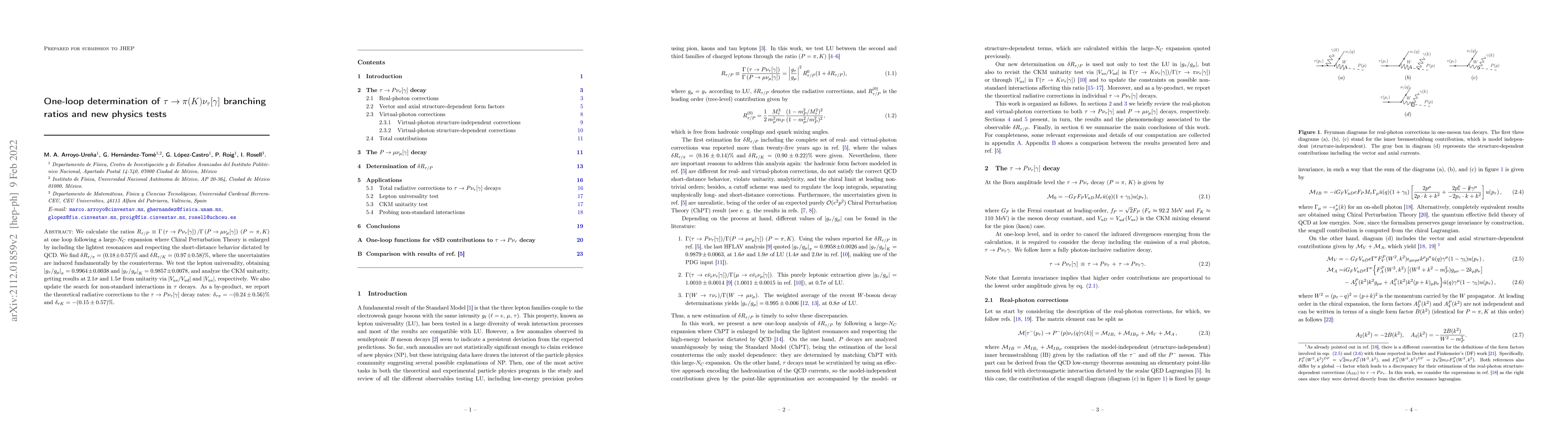 We calculate the ratios $R_{\tau / P}\equiv \Gamma \left( \tau \to P \nu_{\tau}[\gamma] \right) / \Gamma \left(P\to \mu \nu_{\mu}[\gamma]\right)$ ($P=\pi,K$) at one loop following a large-$N_C$ expansion where Chiral Perturbation Theory is enlarged by including the lightest resonances and respecting the short-distance behavior dictated by QCD. We find $\delta R_{\tau/\pi}=(0.18\pm 0.57 )\%$ and $\delta R_{\tau/K}=(0.97\pm 0.58 )\%$, where the uncertainties are induced fundamentally by the counterterms. We test the lepton universality, obtaining $\left|g_\tau/g_\mu\right|_\pi=0.9964\pm 0.0038$ and $\left|g_\tau/g_\mu\right|_K=0.9857\pm 0.0078$, and analyze the CKM unitarity, getting results at $2.1\sigma$ and $1.5\sigma$ from unitarity via $|V_{us}/V_{ud}|$ and $|V_{us}|$, respectively. We also update the search for non-standard interactions in $\tau$ decays. As a by-product, we report the theoretical radiative corrections to the $\tau \to P \nu_{\tau}[\gamma]$ decay rates: $\delta_{\tau \pi} = -(0.24 \pm 0.56) \%$ and $\delta_{\tau K} = -(0.15 \pm 0.57) \%$.} \maketitle