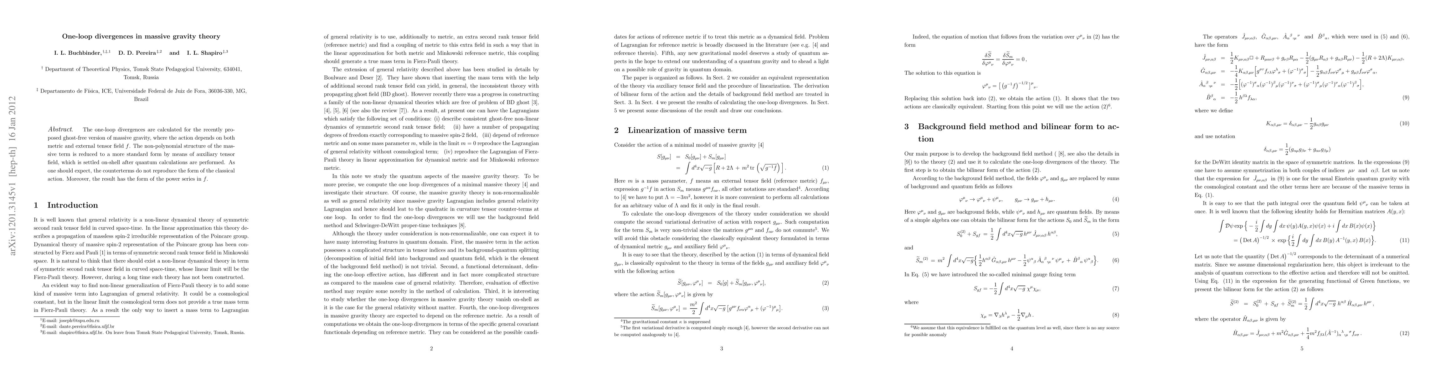 The paper presents a detailed application of the background field method to massive gravity, resulting in a power series expression for one-loop divergences in terms of geometrical invariants and the reference metric f_μν.