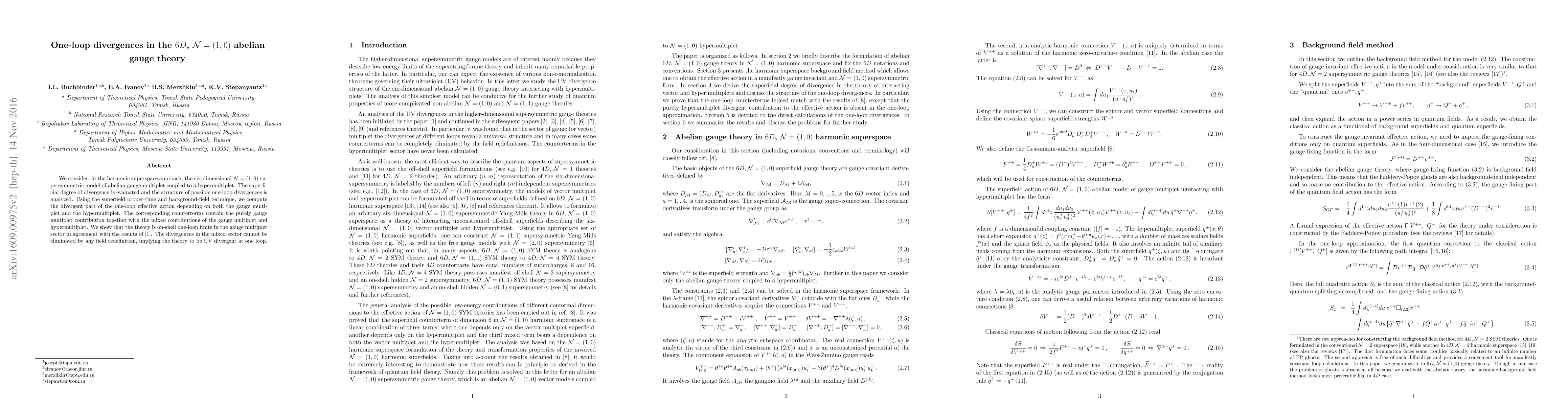 This paper evaluates the one-loop divergences in a 6D N=(1,0) abelian gauge theory using the harmonic superspace approach. It finds that while the gauge multiplet sector is one-loop finite, the mixed sector involving the gauge and hypermultiplets is UV divergent at one loop, indicating inherent divergences that cannot be removed by field redefinitions.