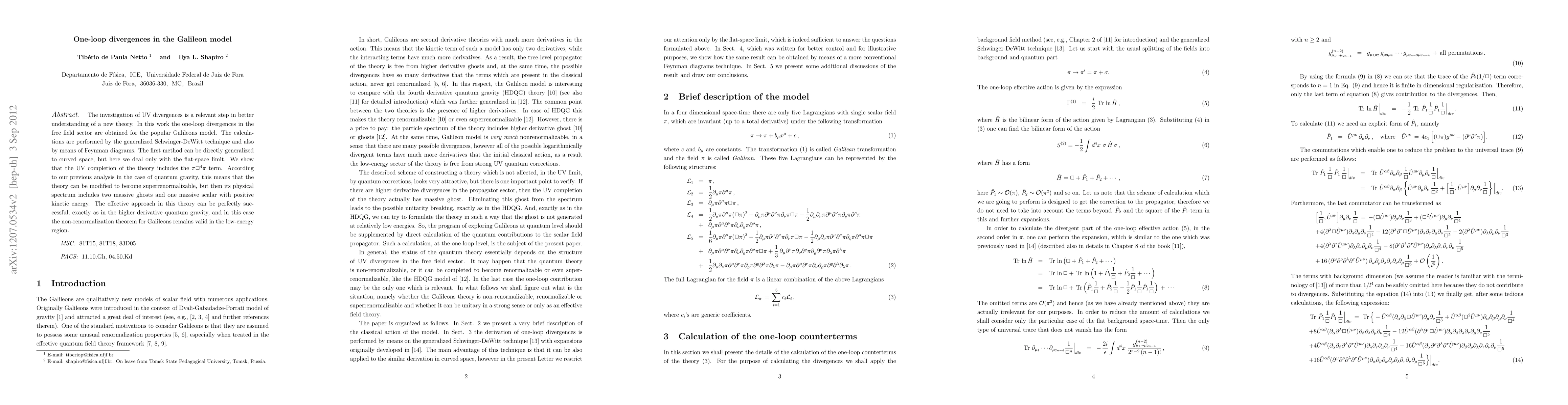This paper investigates one-loop divergences in the Galileon model using the Schwinger-DeWitt technique and Feynman diagrams, revealing that the UV completion includes a $\pi \Box^4\pi$ term, which can make the theory superrenormalizable but introduces two massive ghosts and one massive scalar. The effective approach remains successful, maintaining the non-renormalization theorem for Galileons at low energies.