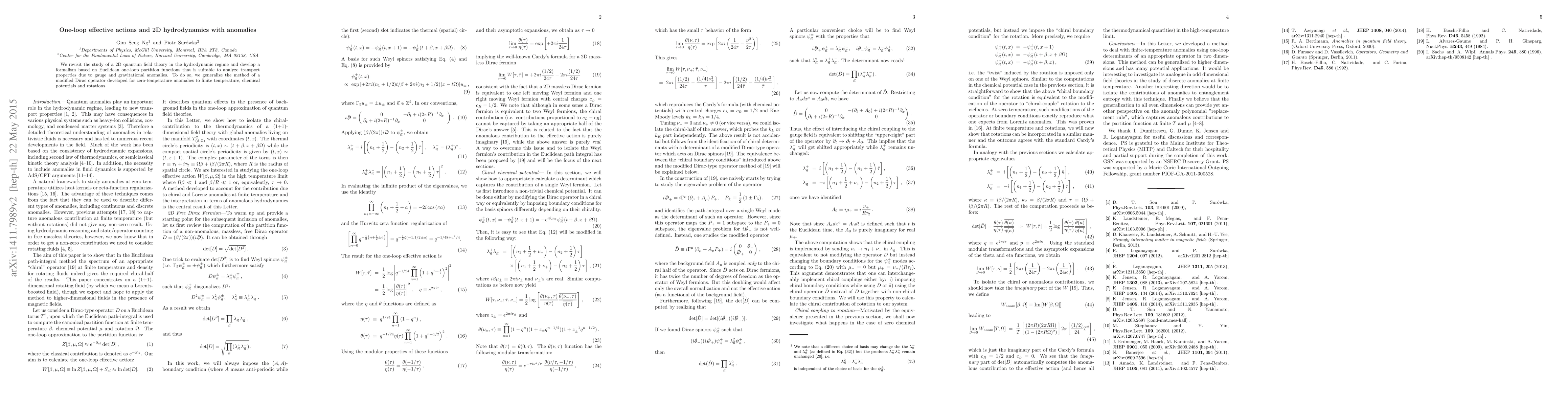 We revisit the study of a 2D quantum field theory in the hydrodynamic regime and develop a formalism based on Euclidean one-loop partition functions that is suitable to analyze transport properties due to gauge and gravitational anomalies. To do so, we generalize the method of a modified Dirac operator developed for zero-temperature anomalies to finite temperature, chemical potentials and rotations.
