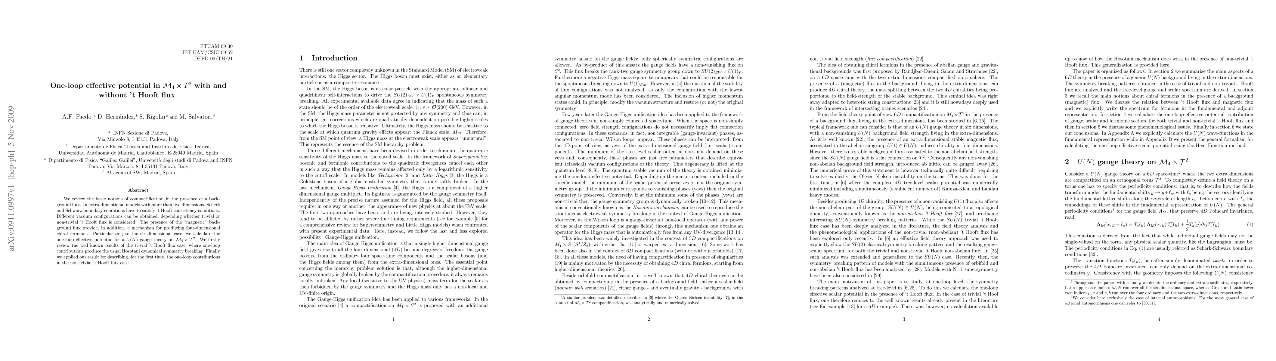 We review the basic notions of compactification in the presence of a background flux. In extra-dimentional models with more than five dimensions, Scherk and Schwarz boundary conditions have to satisfy 't Hooft consistency conditions. Different vacuum configurations can be obtained, depending whether trivial or non-trivial 't Hooft flux is considered. The presence of the "magnetic" background flux provide, in addition, a mechanism for producing four-dimensional chiral fermions. Particularizing to the six-dimensional case, we calculate the one-loop effective potential for a U(N) gauge theory on M4 x T2. We firstly review the well known results of the trivial 't Hooft flux case, where one-loop contributions produce the usual Hosotani dynamical symmetry breaking. Finally we applied our result for describing, for the first time, the one-loop contributions in the non-trivial 't Hooft flux case.