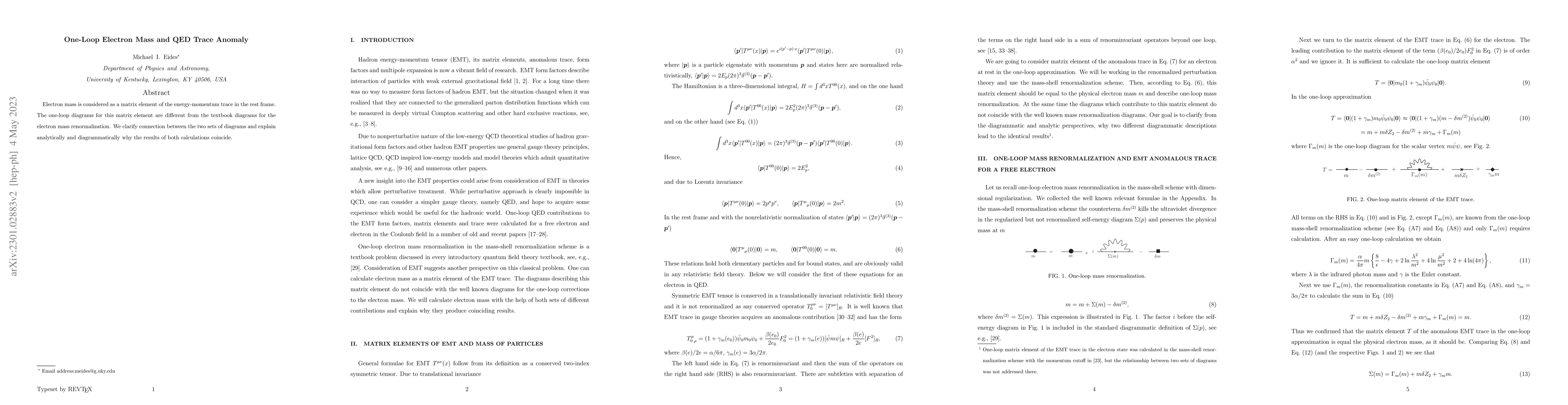 This paper investigates the relationship between one-loop electron mass renormalization and the QED trace anomaly, showing that the matrix element of the energy-momentum trace in the rest frame yields the same result despite differing diagrammatic representations, thus unifying both approaches.