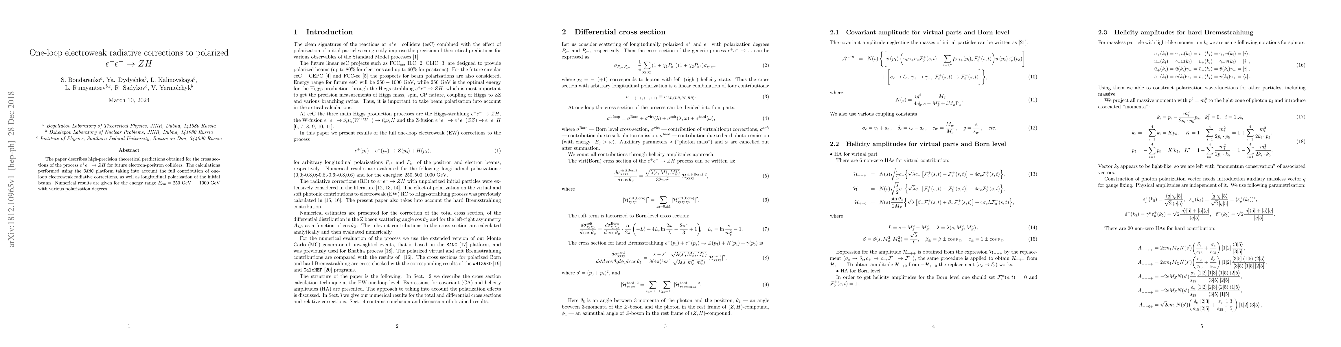 This paper provides high-precision theoretical predictions for the cross sections of $e^+e^- \to ZH$ at future colliders, incorporating one-loop electroweak corrections and analyzing the effects of beam polarization over the energy range of 250 GeV to 1000 GeV. Results are presented for various polarization degrees.