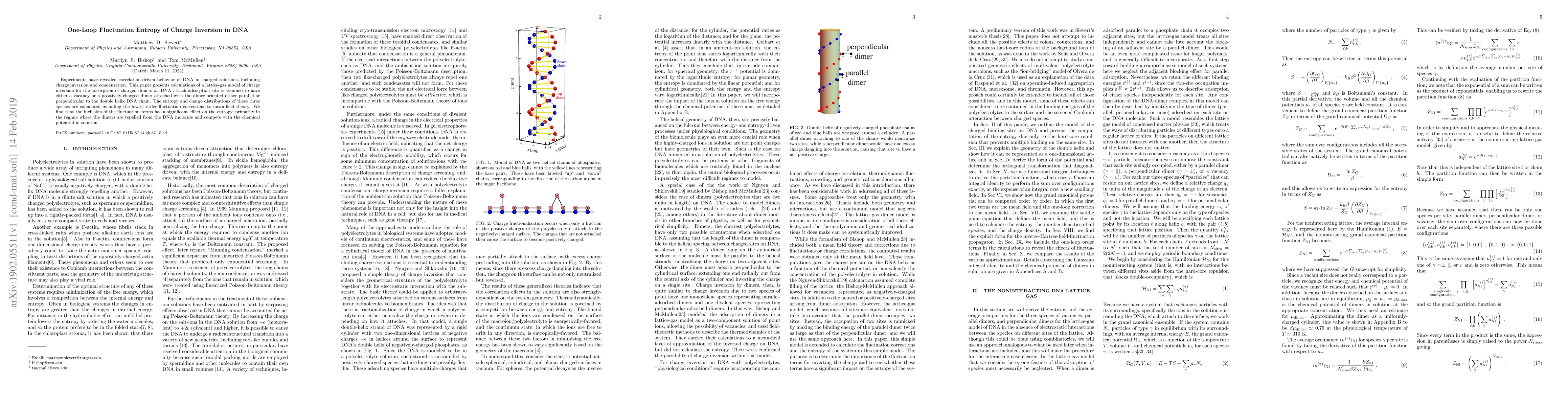 This research calculates fluctuation entropy of charge inversion in DNA using a lattice-gas model. It finds that fluctuation terms significantly impact entropy, especially when dimers are repelled by DNA, challenging mean-field theory assumptions.