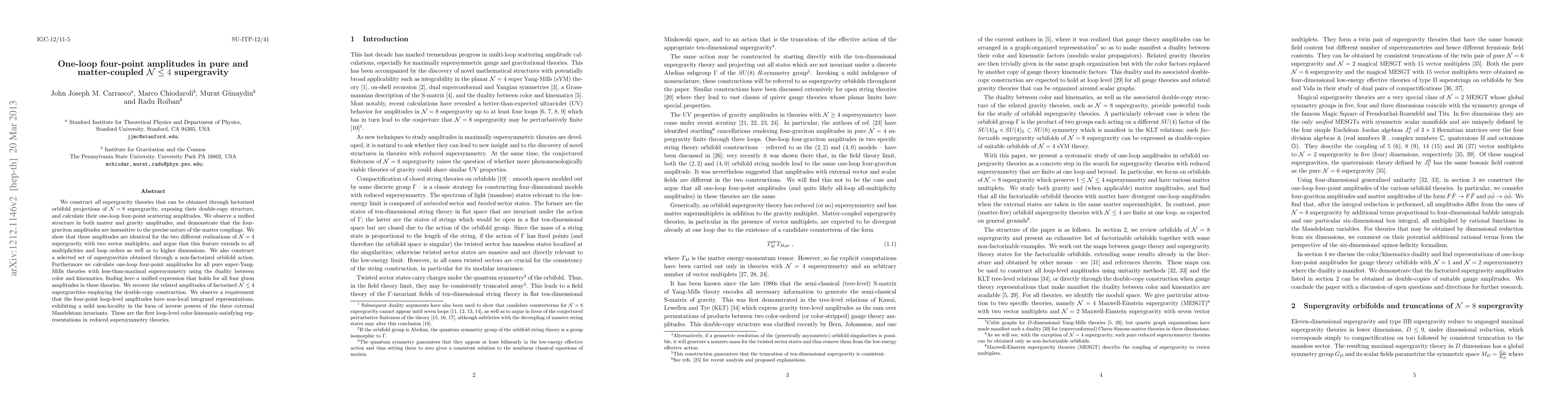 We construct all supergravity theories that can be obtained through factorized orbifold projections of N=8 supergravity, exposing their double-copy structure, and calculate their one-loop four-point scattering amplitudes. We observe a unified structure in both matter and gravity amplitudes, and demonstrate that the four-graviton amplitudes are insensitive to the precise nature of the matter couplings. We show that these amplitudes are identical for the two different realizations of N=4 supergravity with two vector multiplets, and argue that this feature extends to all multiplicities and loop orders as well as to higher dimensions. We also construct a selected set of supergravities obtained through a non-factorized orbifold action. Furthermore we calculate one-loop four-point amplitudes for all pure super-Yang-Mills theories with less-than-maximal supersymmetry using the duality between color and kinematics, finding here a unified expression that holds for all four gluon amplitudes in the theories. We recover the related amplitudes of factorized N<=4 supergravities employing the double-copy construction. We observe a requirement that the four-point loop-level amplitudes have non-local integrand representations, exhibiting a mild non-locality in the form of inverse powers of the three external Mandelstam invariants. These are the first loop-level color-kinematic-satisfying representations in reduced supersymmetry theories.