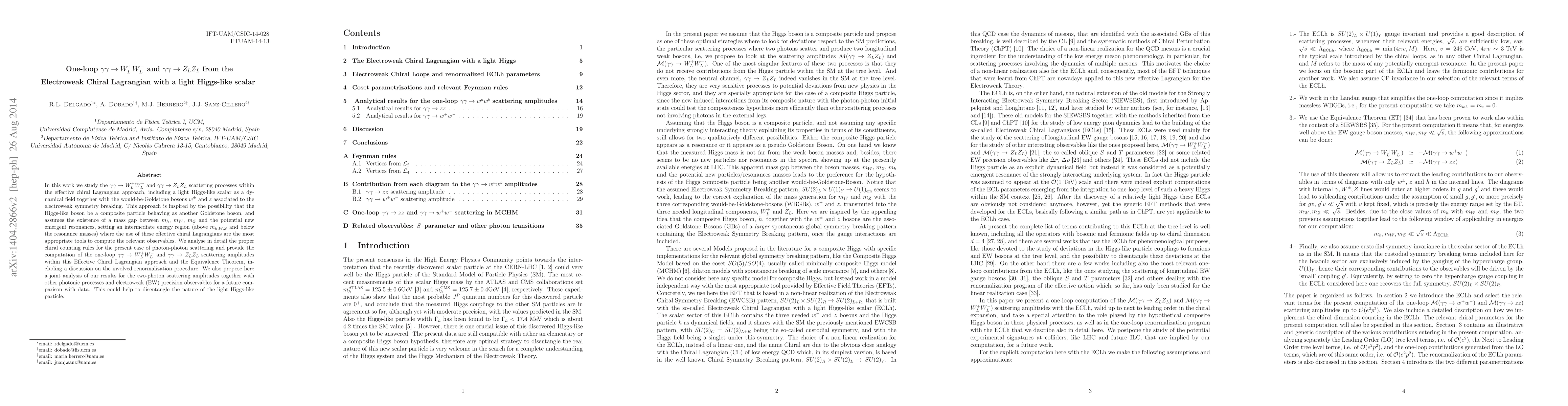 This paper investigates the one-loop scattering processes of $\gamma\gamma\to W^+_L W^-_L$ and $\gamma\gamma\to Z_L Z_L$ using the Electroweak Chiral Lagrangian, incorporating a light Higgs-like scalar and associated Goldstone bosons. The study aims to disentangle the nature of the Higgs-like particle through detailed computations and comparisons with electroweak precision data.