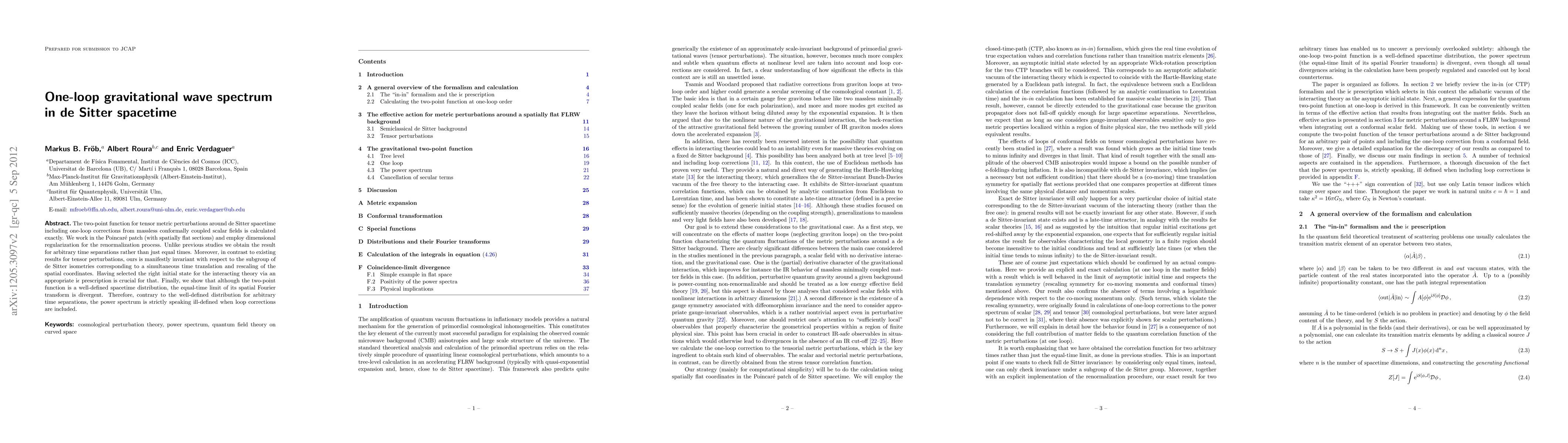 This paper calculates the one-loop gravitational wave spectrum in de Sitter spacetime, including corrections from massless conformally coupled scalar fields. It finds the result for arbitrary time separations and shows that the power spectrum is ill-defined due to divergences in the equal-time limit.