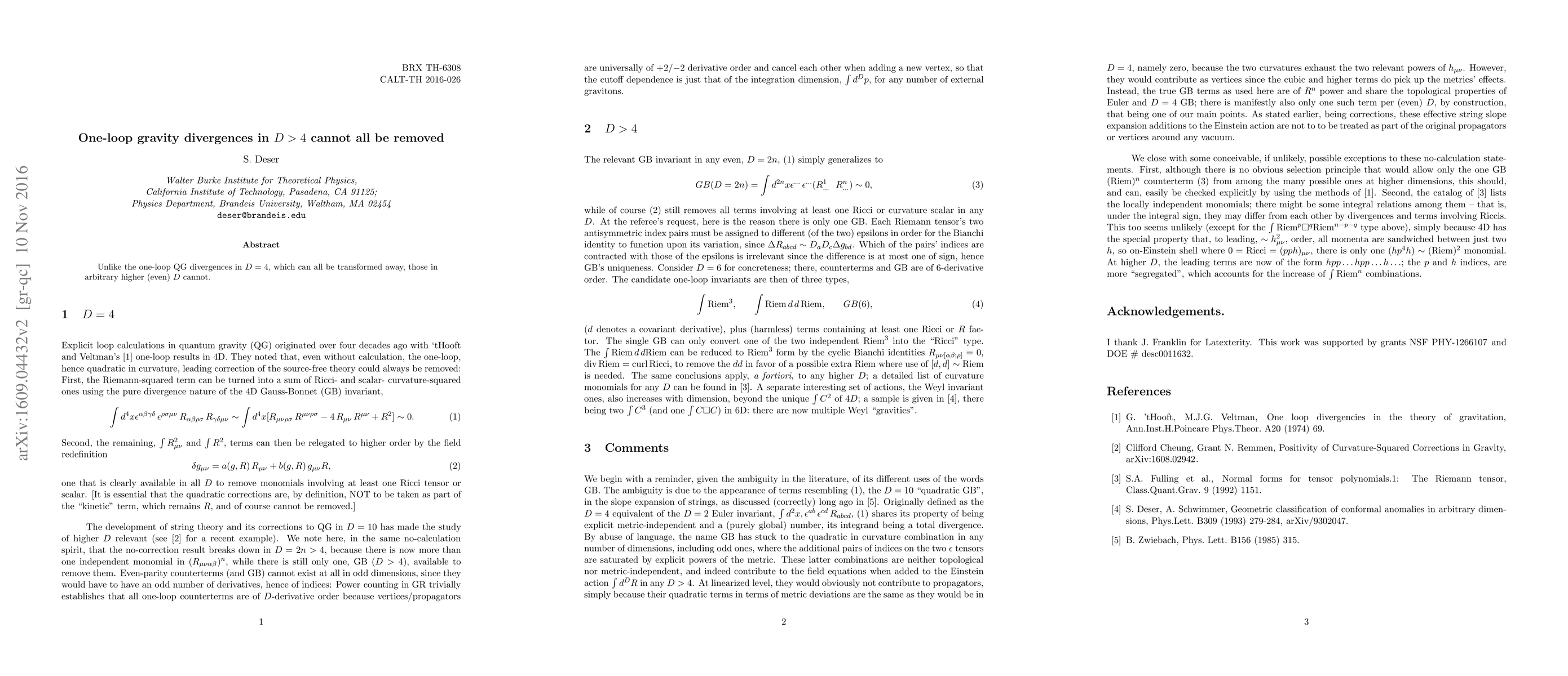 Unlike the one-loop QG divergences in D=4, which can all be transformed away, those in arbitrary higher (even) dimension cannot.