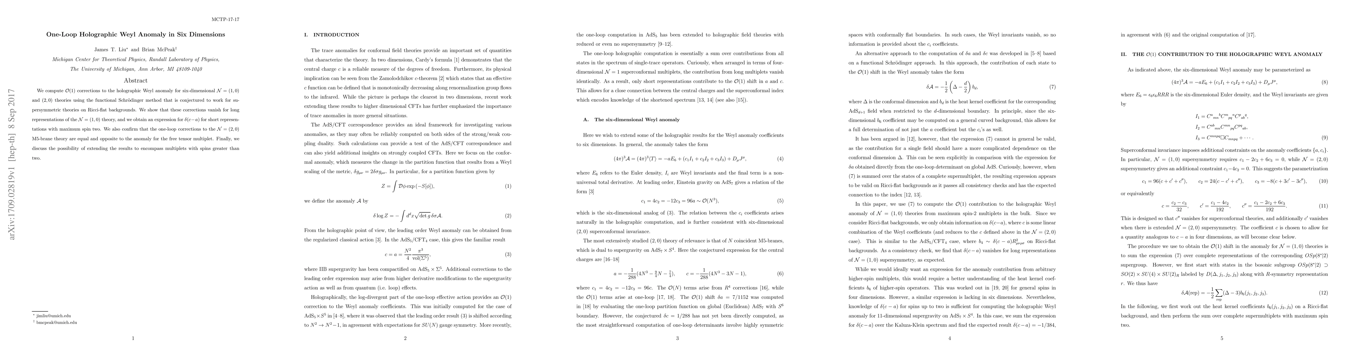 Researchers computed one-loop corrections to holographic Weyl anomalies in six-dimensional supersymmetric theories, finding that long representations cancel out corrections and short representations with spin two have a specific expression for delta(c-a).