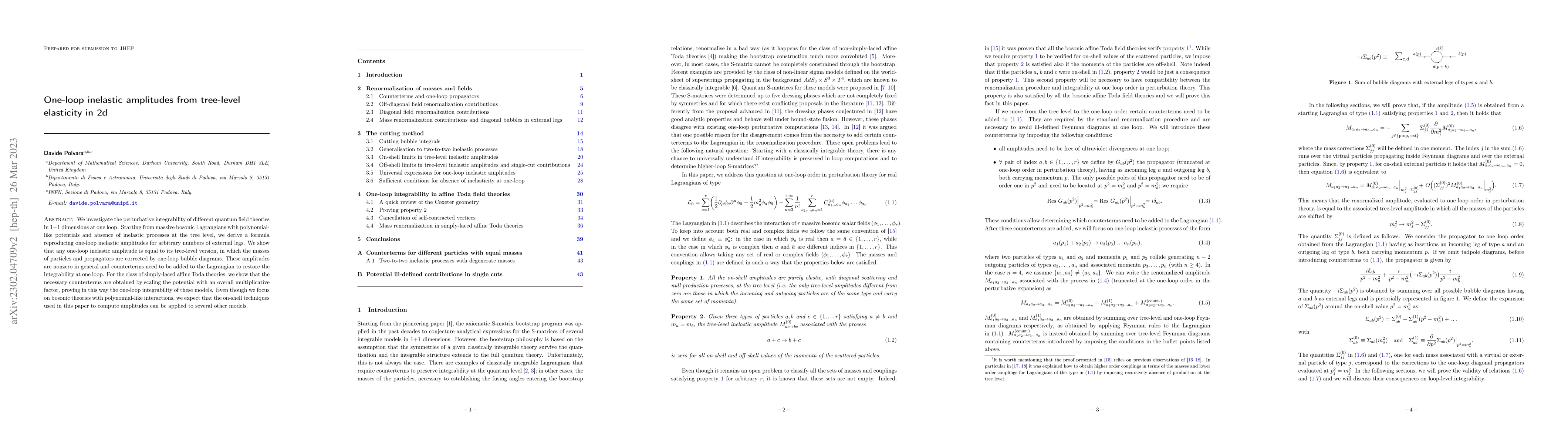 We investigate the perturbative integrability of different quantum field theories in 1+1 dimensions at one loop. Starting from massive bosonic Lagrangians with polynomial-like potentials and absence of inelastic processes at the tree level, we derive a formula reproducing one-loop inelastic amplitudes for arbitrary numbers of external legs. We show that any one-loop inelastic amplitude is equal to its tree-level version, in which the masses of particles and propagators are corrected by one-loop bubble diagrams. These amplitudes are nonzero in general and counterterms need to be added to the Lagrangian to restore the integrability at one loop. For the class of simply-laced affine Toda theories, we show that the necessary counterterms are obtained by scaling the potential with an overall multiplicative factor, proving in this way the one-loop integrability of these models. Even though we focus on bosonic theories with polynomial-like interactions, we expect that the on-shell techniques used in this paper to compute amplitudes can be applied to several other models.