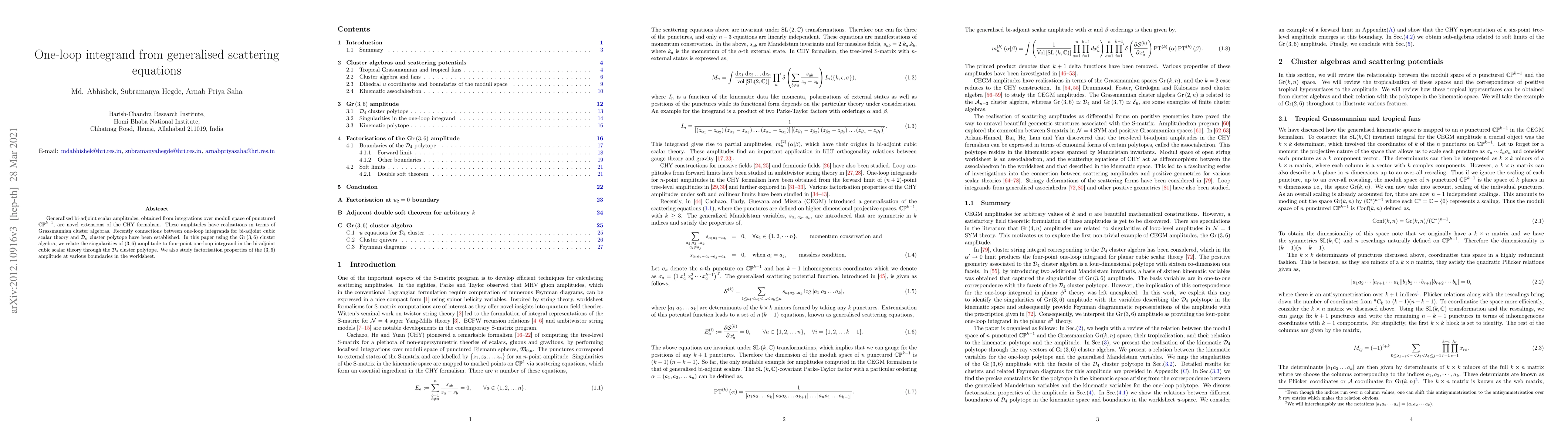 This paper explores the connection between one-loop integrands in bi-adjoint cubic scalar theory and generalised scattering equations, using $\mathcal{D}_4$ cluster polytopes. It relates singularities of the $(3,6)$ amplitude to the four-point one-loop integrand via $\text{Gr}(3,6)$ cluster algebra and investigates the factorisation properties of the $(3,6)$ amplitude at different worldsheet boundaries.