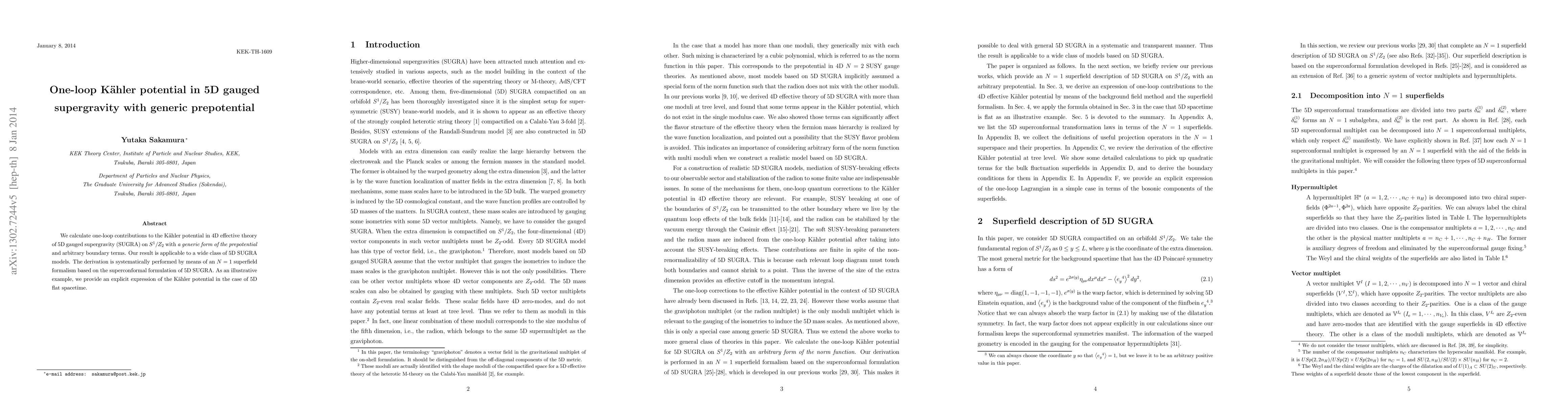 This paper calculates one-loop contributions to the Kaehler potential in 4D effective 5D gauged supergravity on S^1/Z_2, using a generic prepotential and arbitrary boundary terms. The derivation employs an N=1 superfield formalism based on the superconformal formulation, applicable to various 5D SUGRA models.