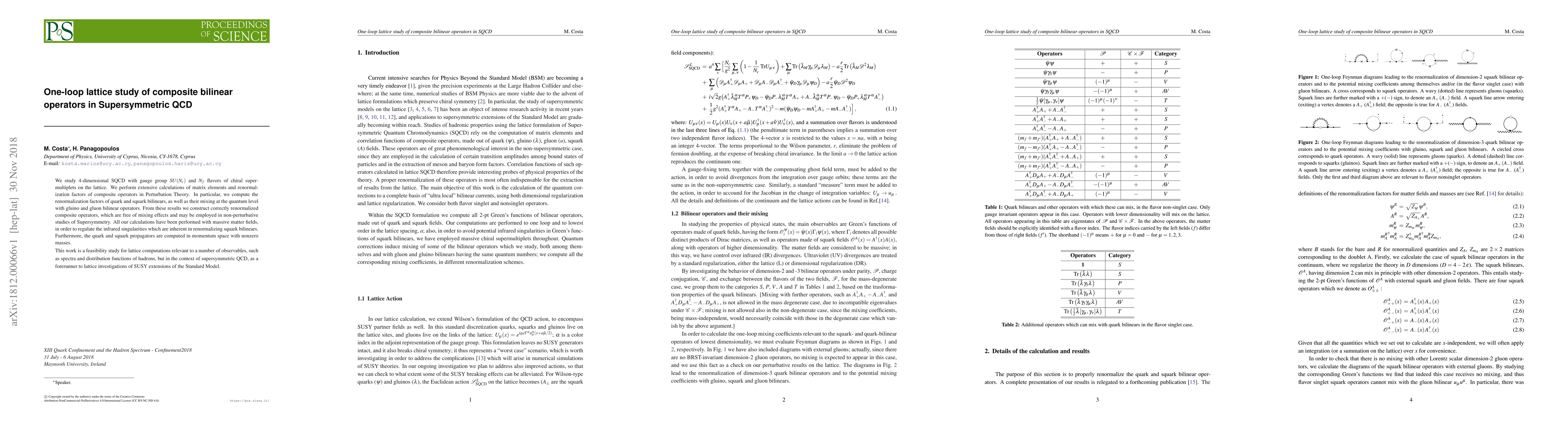 This paper conducts a one-loop lattice study of composite bilinear operators in 4-dimensional supersymmetric QCD, focusing on renormalization factors and mixing effects of quark and squark bilinears with gluino and gluon operators. The study aims to provide correctly renormalized operators for future non-perturbative studies of supersymmetry.