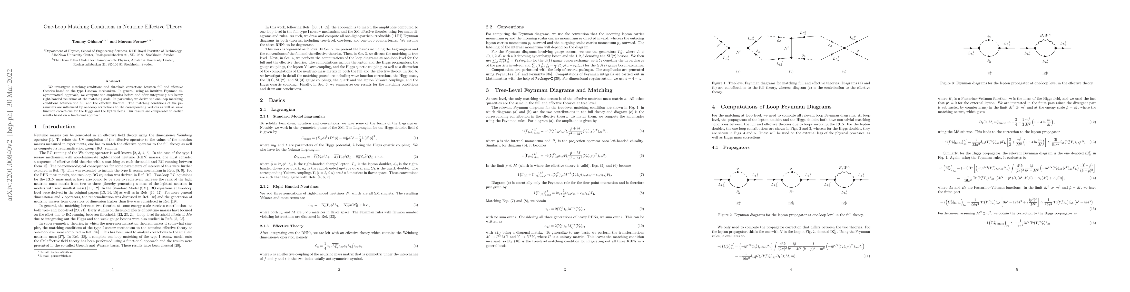 This paper derives one-loop matching conditions between full and effective neutrino theories using the type I seesaw mechanism, focusing on the impact of integrating out heavy right-handed neutrinos. The study finds that these matching conditions are affected by one-loop corrections and wave function modifications for Higgs and lepton fields.