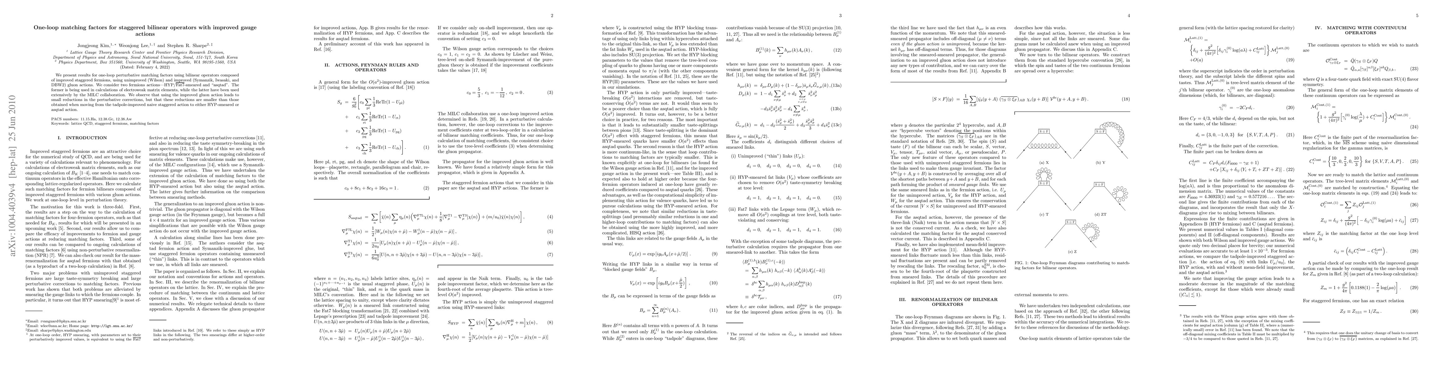 This paper reports on one-loop perturbative matching factors for bilinear operators using improved staggered fermions with various improved gluon actions, finding that while improved gluon actions reduce perturbative corrections, the reductions are smaller than those achieved by switching to better fermion actions.