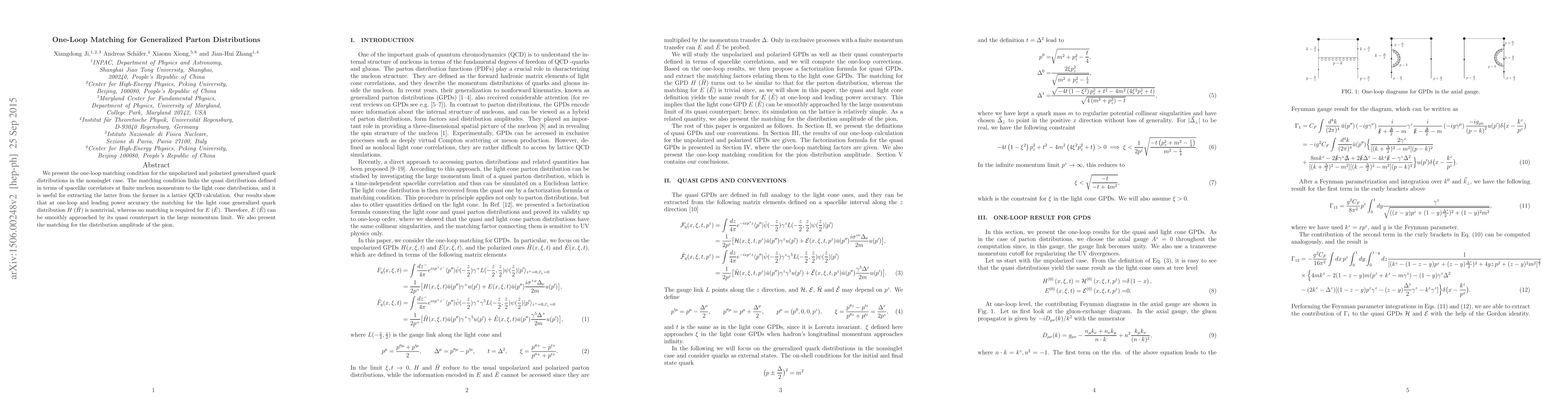 We present the one-loop matching condition for the unpolarized and polarized generalized quark distributions in the non-singlet case. The matching condition links the quasi distributions defined in terms of spacelike correlators at finite nucleon momentum to the light-cone distributions, and is useful for extracting the latter from the former in a lattice QCD calculation. Our results show that at one-loop and leading power accuracy the matching for the light-cone generalized quark distribution $H$ ($\tilde H$) is non-trivial, whereas no matching is required for $E$ ($\tilde E$). Therefore, $E$ ($\tilde E$) can be smoothly approached by its quasi counterpart in the large momentum limit. We also present the matching for the distribution amplitude of the pion.