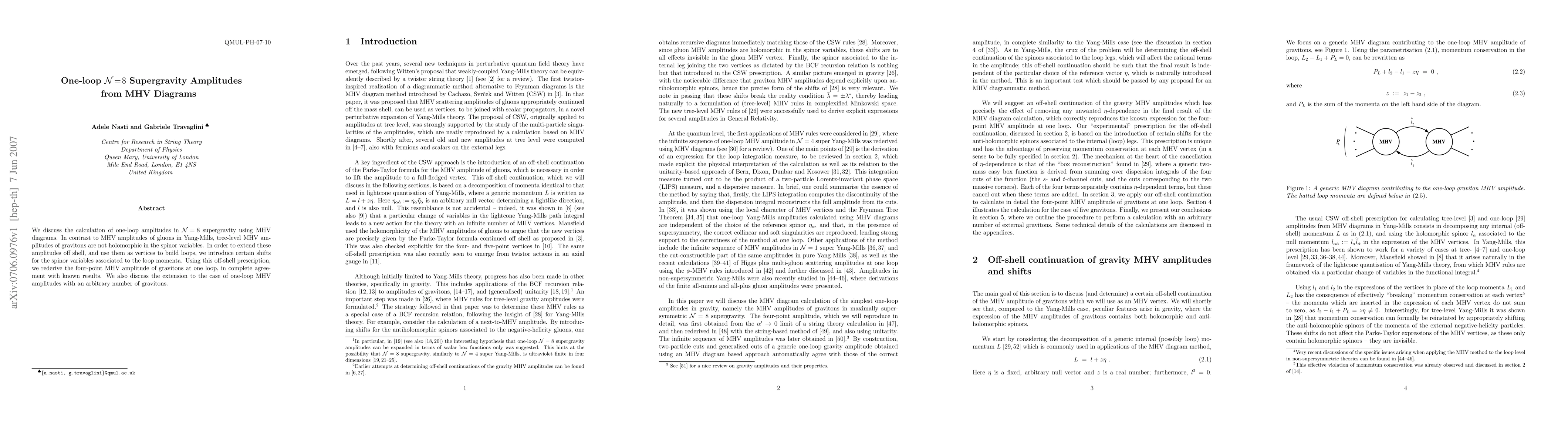 This paper calculates one-loop amplitudes in N=8 supergravity using modified MHV diagrams, introducing shifts for spinor variables associated with loop momenta to extend tree-level MHV amplitudes off shell. It rederives the four-point MHV amplitude for gravitons at one loop, confirming known results and extending the method to arbitrary graviton counts.