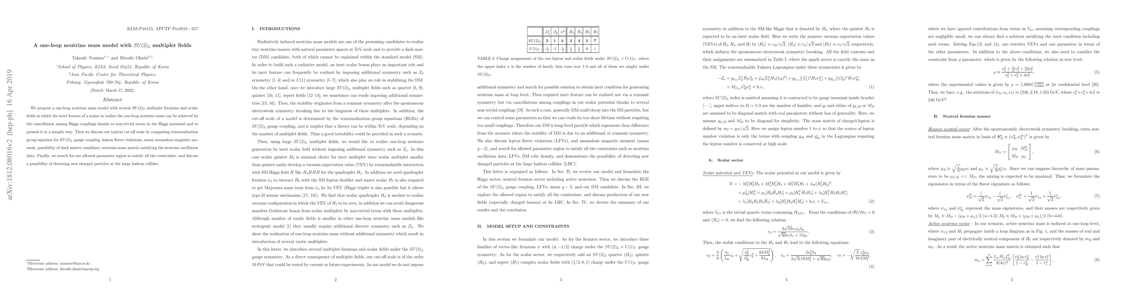 This paper proposes a one-loop neutrino mass model utilizing $SU(2)_L$ multiplets, where inert scalars achieve mass generation through cancellations in Higgs couplings. It explores the model's implications for gauge coupling, flavor violations, dark matter, and neutrino oscillation data, and identifies parameter regions consistent with experimental constraints, while also considering new particle detection at the LHC.