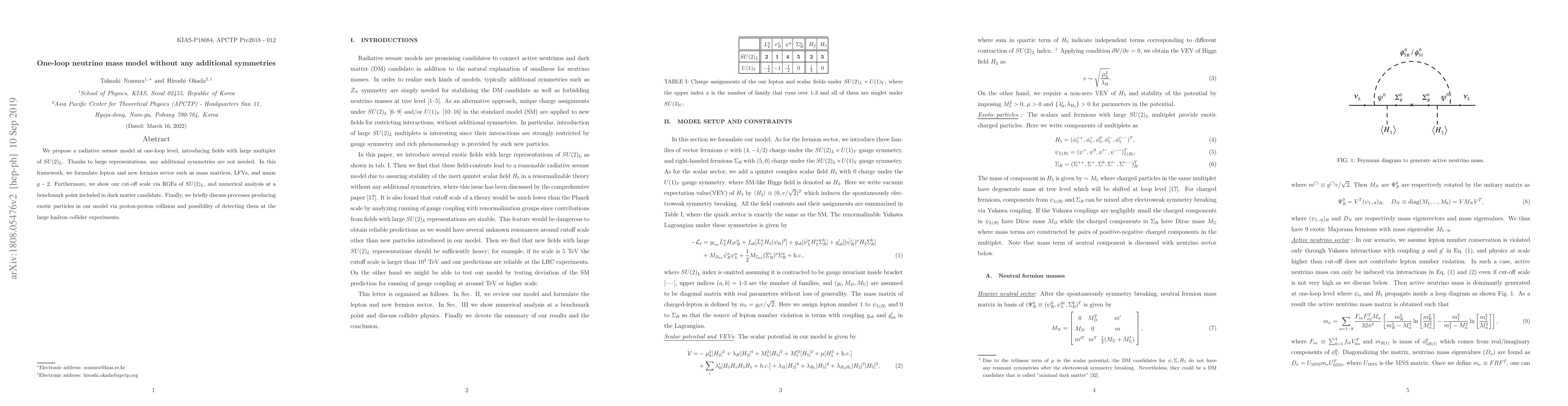 We propose a radiative seesaw model at one-loop level, introducing fields with large multiplet of $SU(2)_L$. Thanks to large representations, any additional symmetries are not needed. In this framework, we formulate lepton and new fermion sector such as mass matrices, LFVs, and muon $g-2$. Furthermore, we show our cut-off scale via RGEs of $SU(2)_L$, and numerical analysis at a benchmark point included in dark matter candidate. Finally, we brief discuss possibility to detect at colliders.