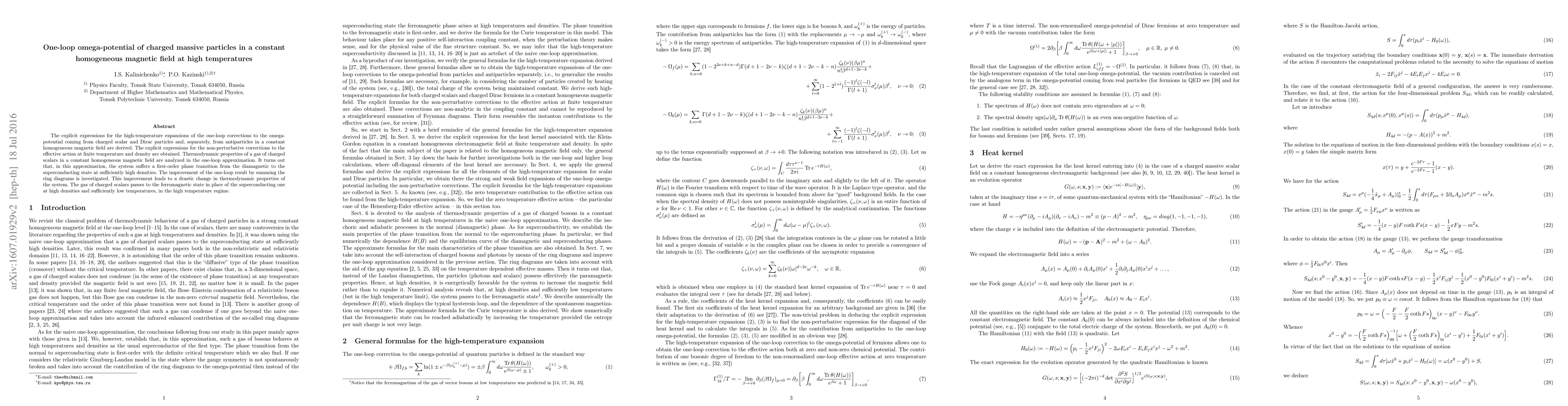 This paper derives high-temperature expansions for one-loop corrections to the omega-potential of charged massive particles in a magnetic field, revealing a first-order phase transition from diamagnetic to superconducting state at high densities. Summing ring diagrams alters this transition, leading to a ferromagnetic state instead.