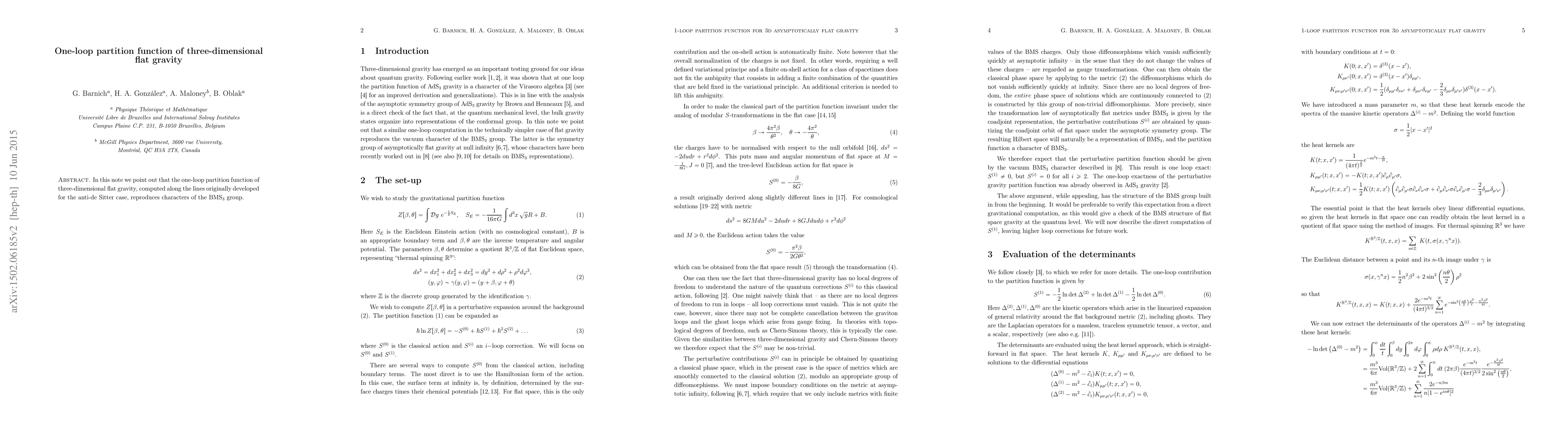 Summary: This paper demonstrates that the one-loop partition function of three-dimensional flat gravity, calculated using methods initially developed for anti-de Sitter gravity, yields characters of the BMS3 group, highlighting a connection between flat and anti-de Sitter gravity at the quantum level.