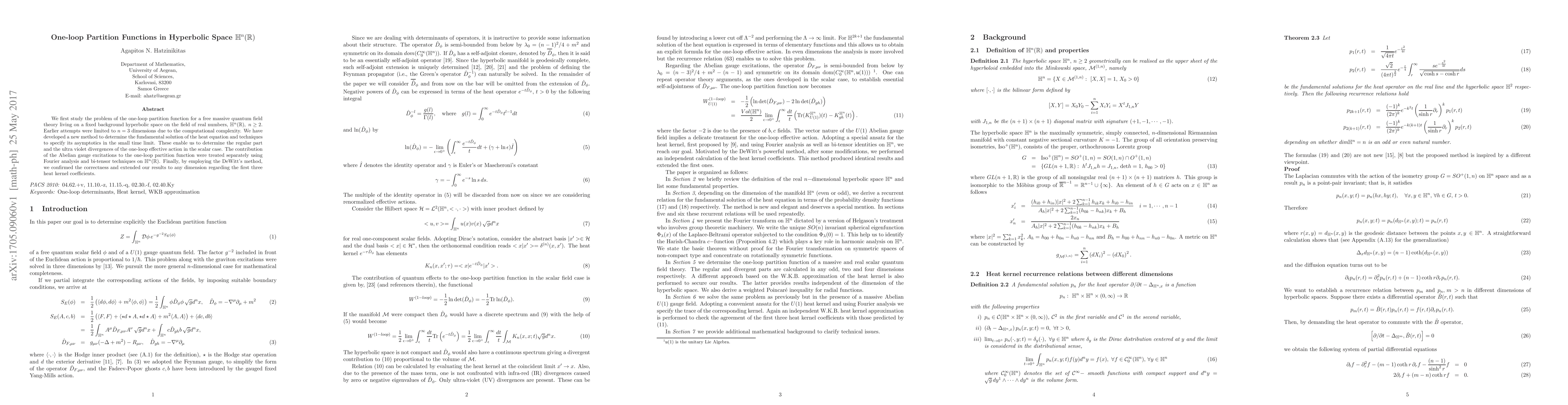 We first study the problem of the one-loop partition function for a free massive quantum field theory living on a fixed background hyperbolic space on the field of real numbers, $\mathbb{H}^n(\mathbb{R}), \,\, n\geq 2$. Earlier attempts were limited to $n=3$ dimensions due to the computational complexity. We have developed a new method to determine the fundamental solution of the heat equation and techniques to specify its asymptotics in the small time limit. These enable us to determine the regular part and the ultra violet divergences of the one-loop effective action in the scalar case. The contribution of the Abelian gauge excitations to the one-loop partition function were treated separately using Fourier analysis and bi-tensor techniques on $\mathbb{H}^n(\mathbb{R})$. Finally, by employing the DeWitt's method, we confirmed the correctness and extended our results to any dimension regarding the first three heat kernel coefficients.