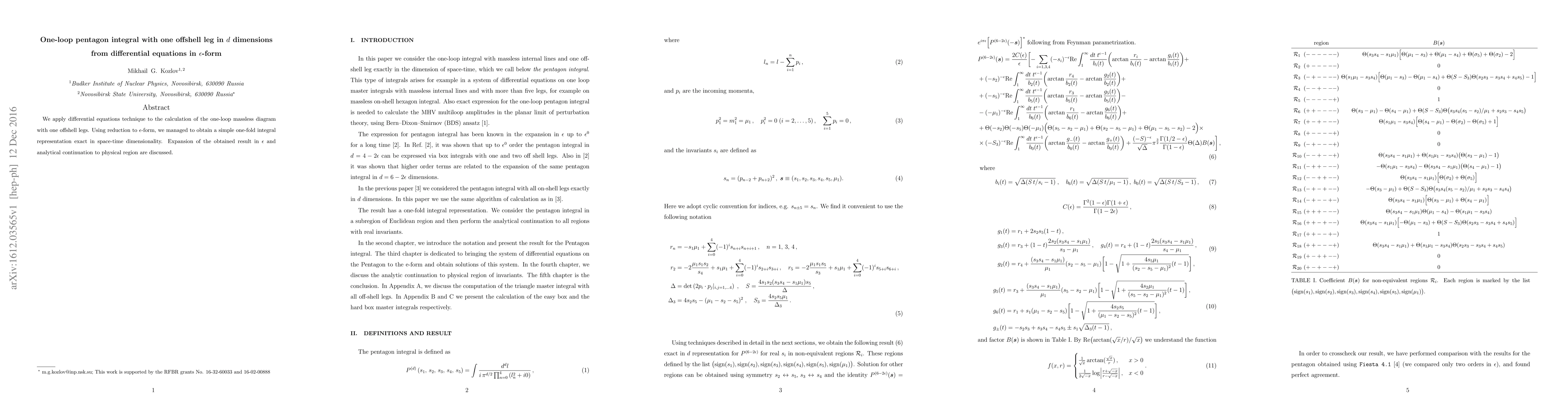 We apply differential equations technique to the calculation of the one-loop massless diagram with one offshell legs. Using reduction to $\epsilon$-form, we managed to obtain a simple one-fold integral representation exact in space-time dimensionality. Expansion of the obtained result in $\epsilon$ and analytical continuation to physical region are discussed.