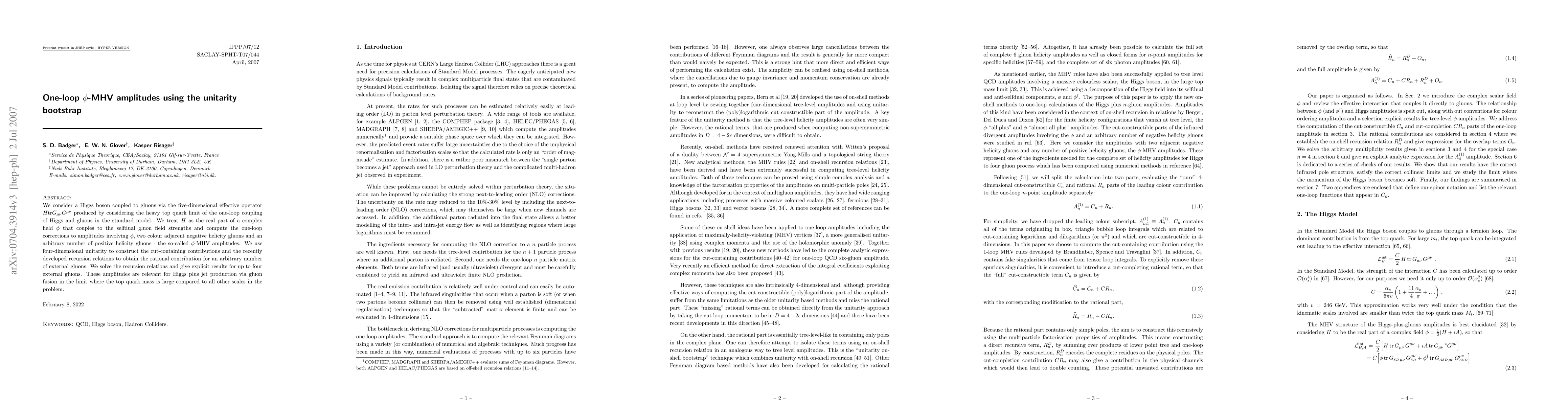 We consider a Higgs boson coupled to gluons via the five-dimensional effective operator H Tr G_{munu}G^{munu} produced by considering the heavy top quark limit of the one-loop coupling of Higgs and gluons in the standard model. We treat H as the real part of a complex field phi that couples to the selfdual gluon field strengths and compute the one-loop corrections to amplitudes involving phi, two colour adjacent negative helicity gluons and an arbitrary number of positive helicity gluons - the so-called phi-MHV amplitudes. We use four-dimensional unitarity to construct the cut-containing contributions and the recently developed recursion relations to obtain the rational contribution for an arbitrary number of external gluons. We solve the recursion relations and give explicit results for up to four external gluons. These amplitudes are relevant for Higgs plus jet production via gluon fusion in the limit where the top quark mass is large compared to all other scales in the problem.